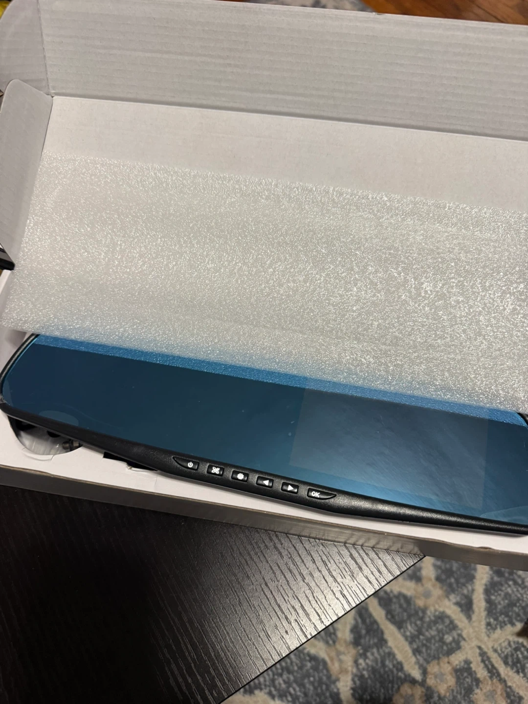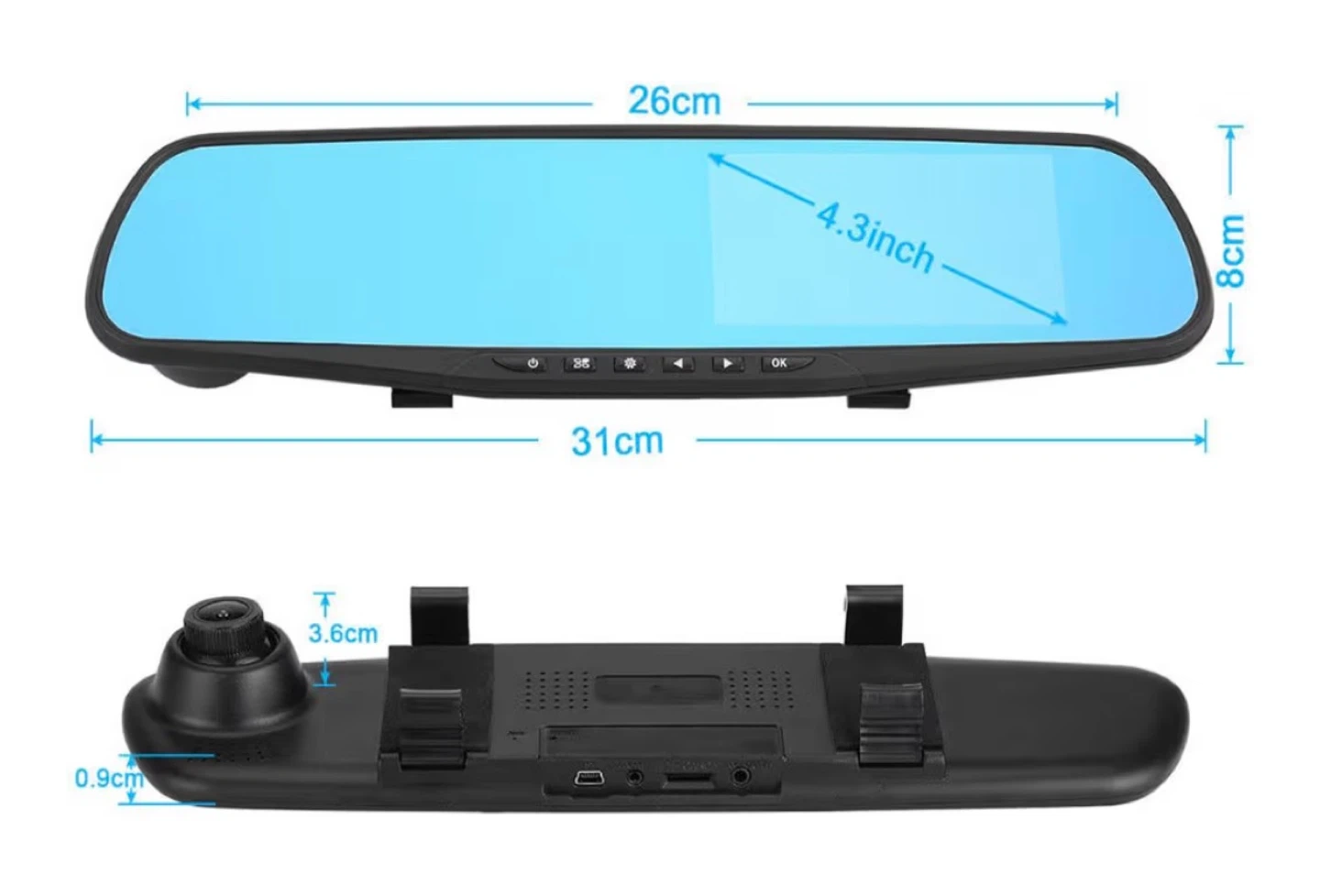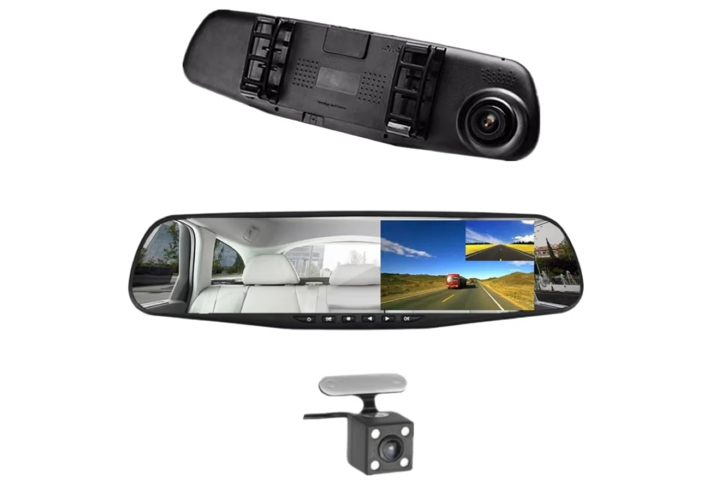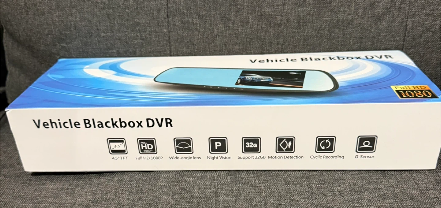 This is a rearview mirror dual channel dash cam. It's a Full HD 1080P device with a 4.5" TFT display and wide-angle lens. Supports night vision and motion detection.