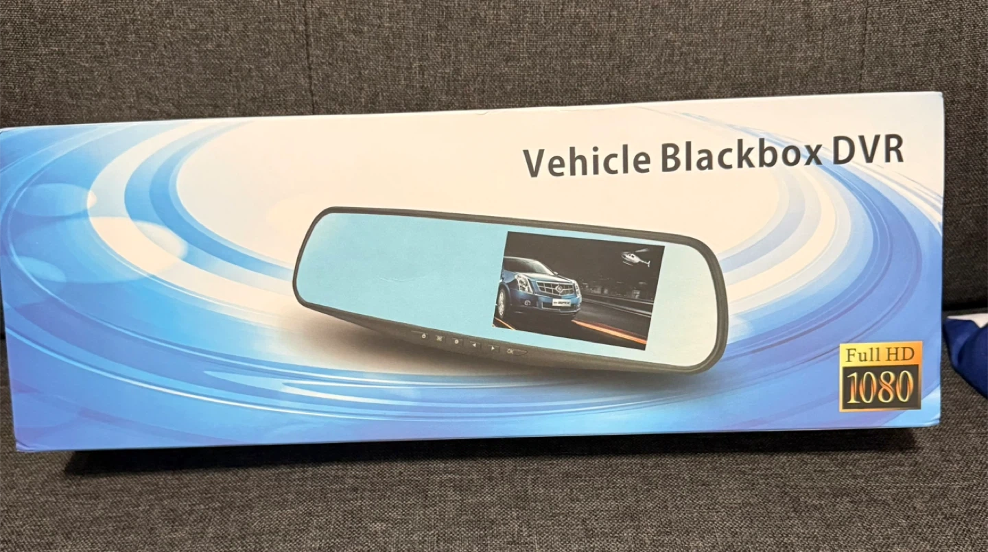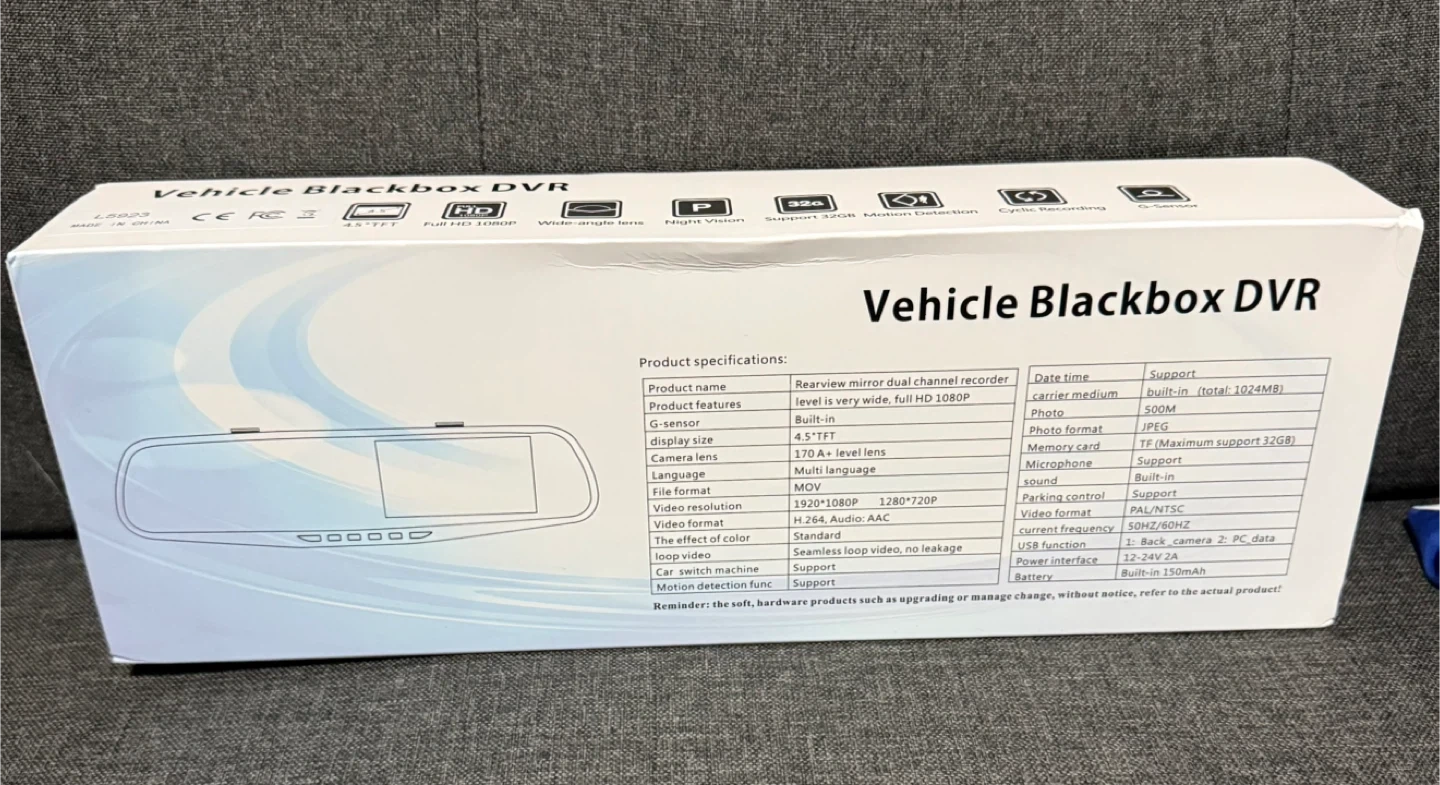 This is a rearview mirror dual channel dash cam. It's a Full HD 1080P device with a 4.5" TFT display and wide-angle lens. Supports night vision and motion detection.
