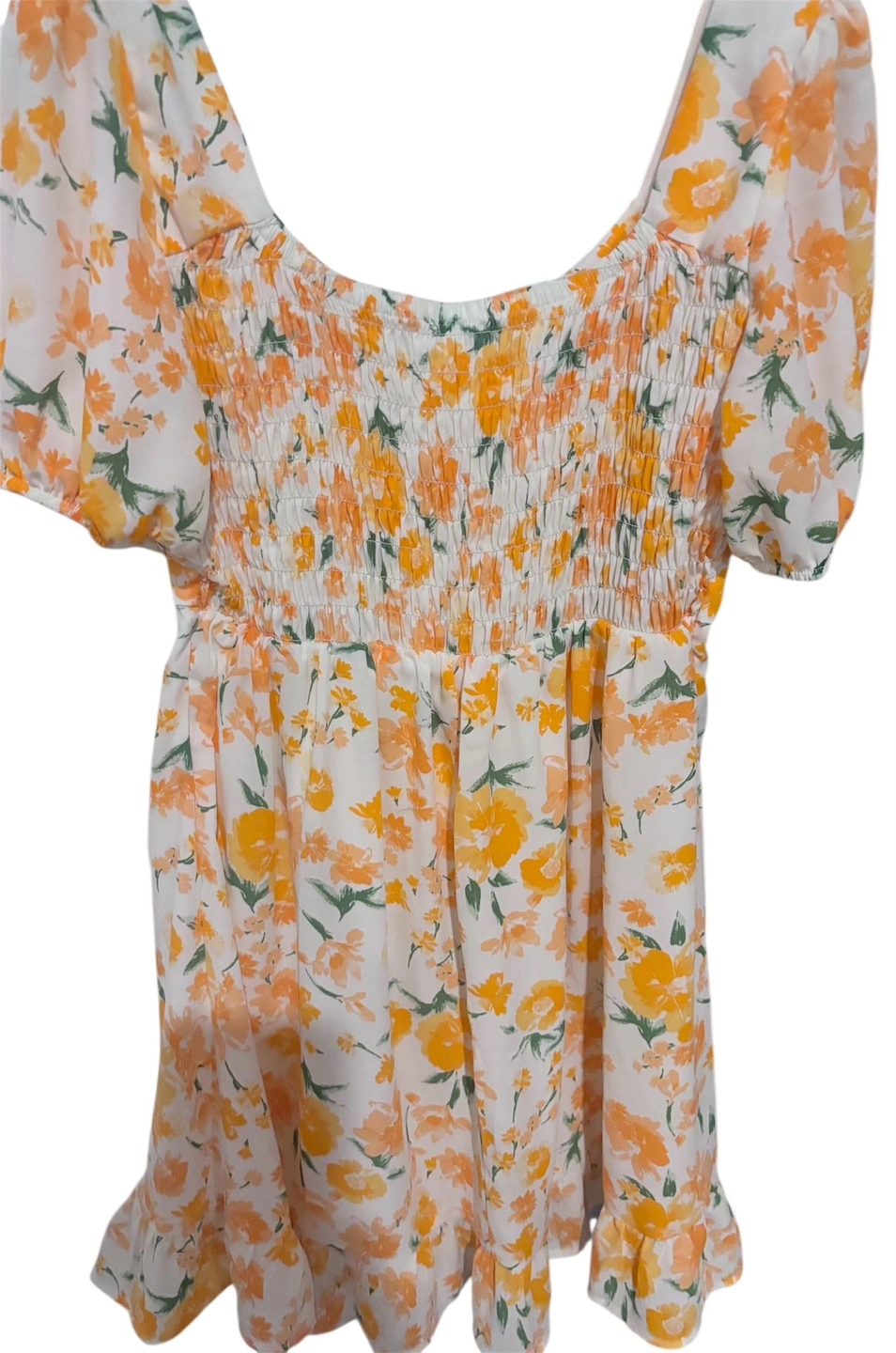 Fresh, feminine, and perfect for warm weather, this Sienna Sky floral mini dress is an easy go-to for summer days, vacation nights, or weekend brunch. Featuring a flattering off-shoulder neckline, a front bow tie detail, and a fully smocked back for comfort and stretch. The soft yellow and orange floral pattern pops beautifully against the cream background, giving it a cheerful, breezy look that’s super versatile for casual or dressy occasions.