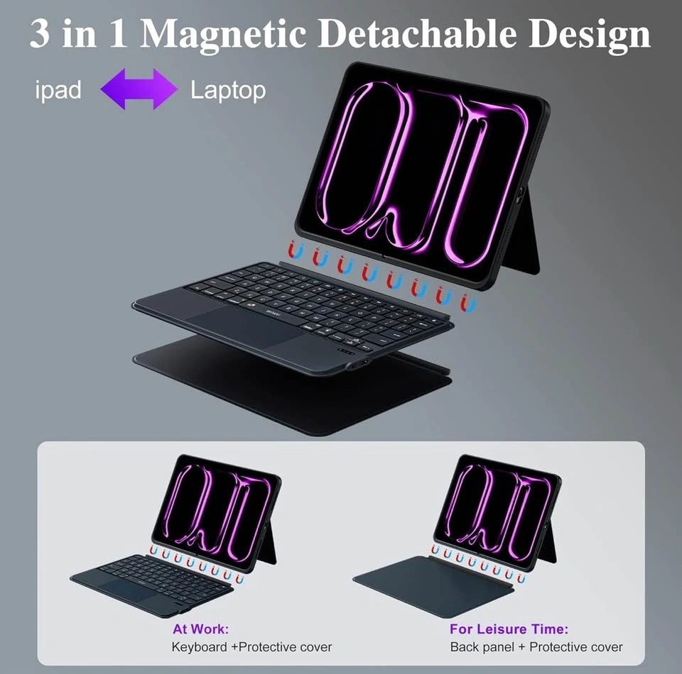 Magnetic 3 in 1 Design: Detachable magnetic keyboard for ipad case stand,strong magnets secure stable attachment. Instantly transforms iPad case into a typing keyboard or adjustable viewing stand. Suitable for movies, video calls and meetings. Ideal for office travel and outdoor adventures. PU Leather full-edge coverage, protects iPad from drops and scratches