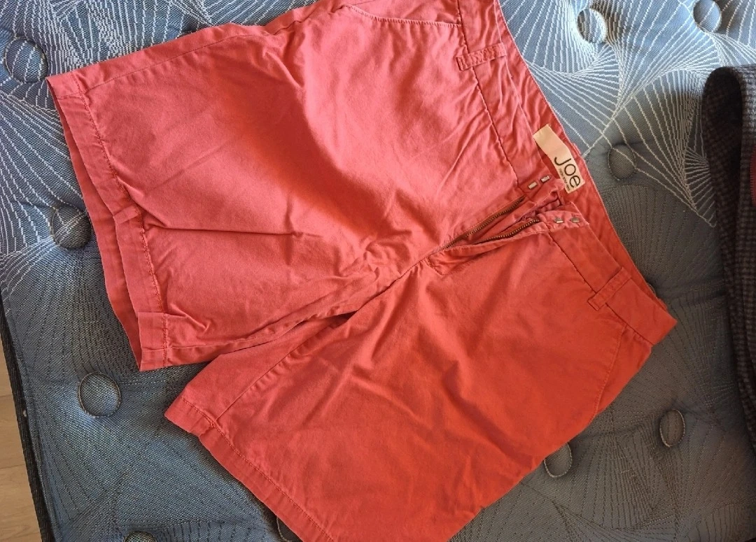 Includes black athletic shorts, coral pink chino shorts, tan chino shorts, and teal and white striped lounge shorts. Brands include Joe Fresh, Old Navy & ACX.