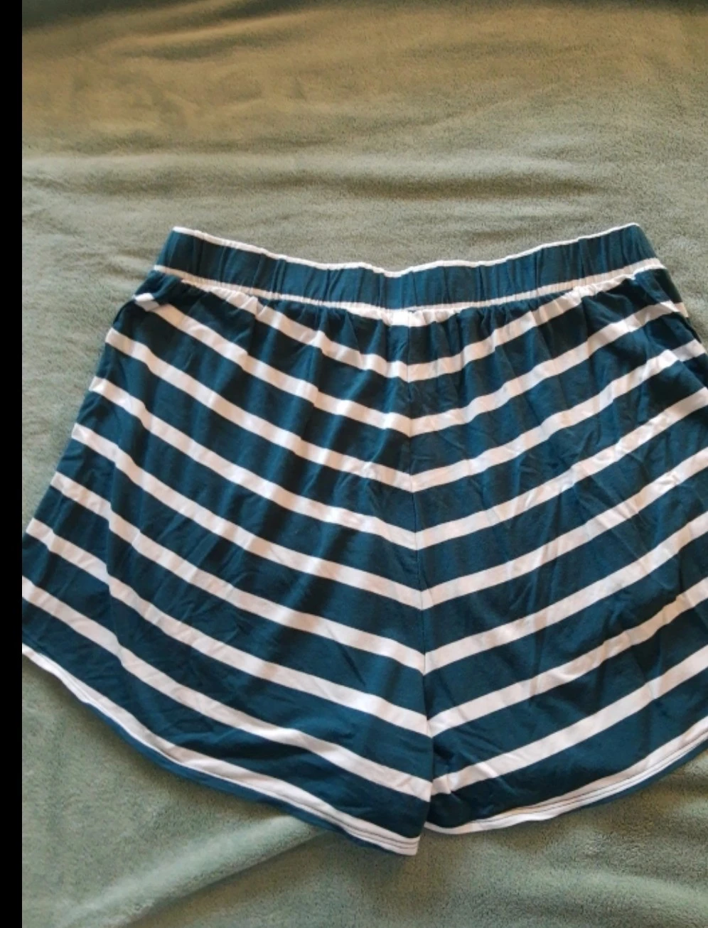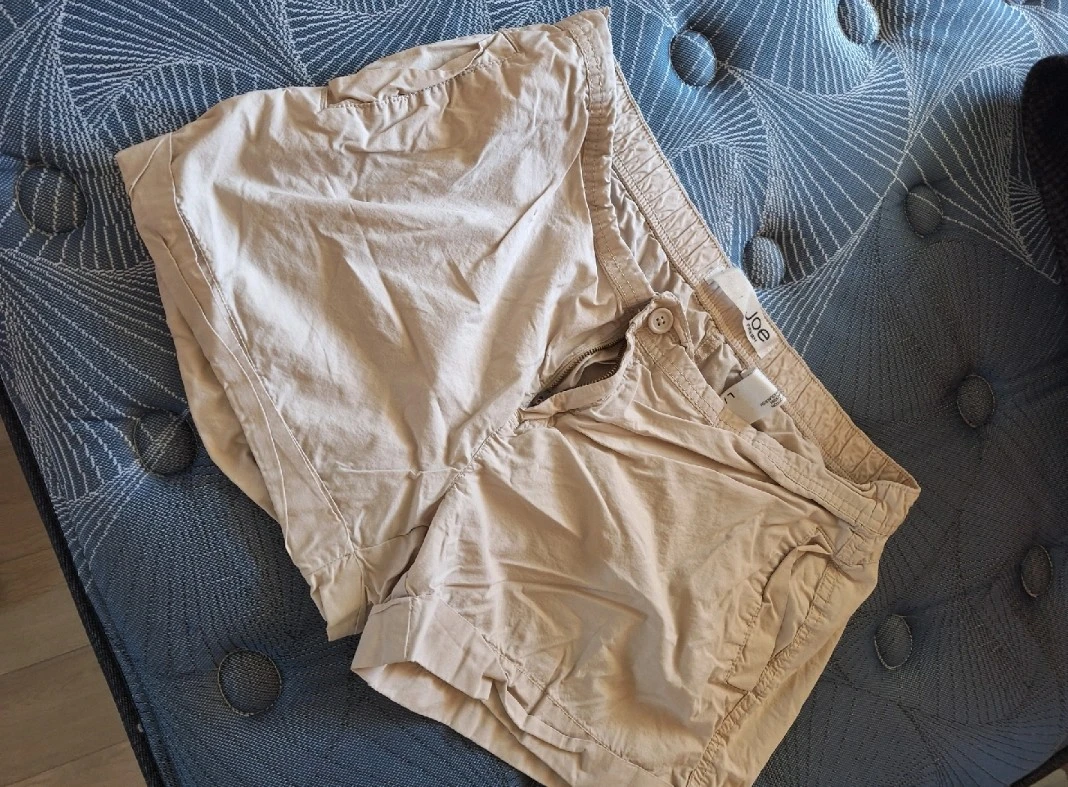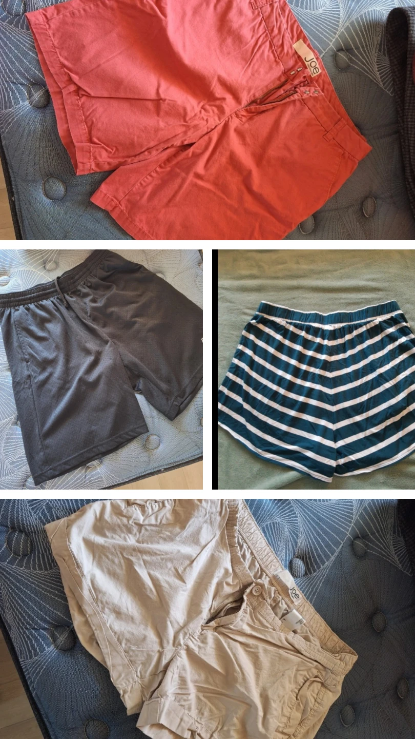 Includes black athletic shorts, coral pink chino shorts, tan chino shorts, and teal and white striped lounge shorts. Brands include Joe Fresh, Old Navy & ACX.