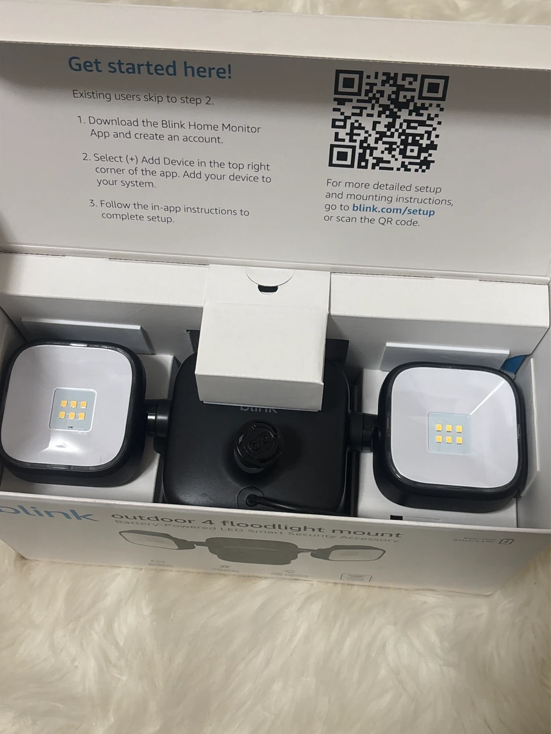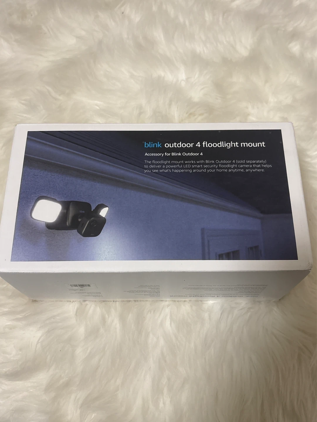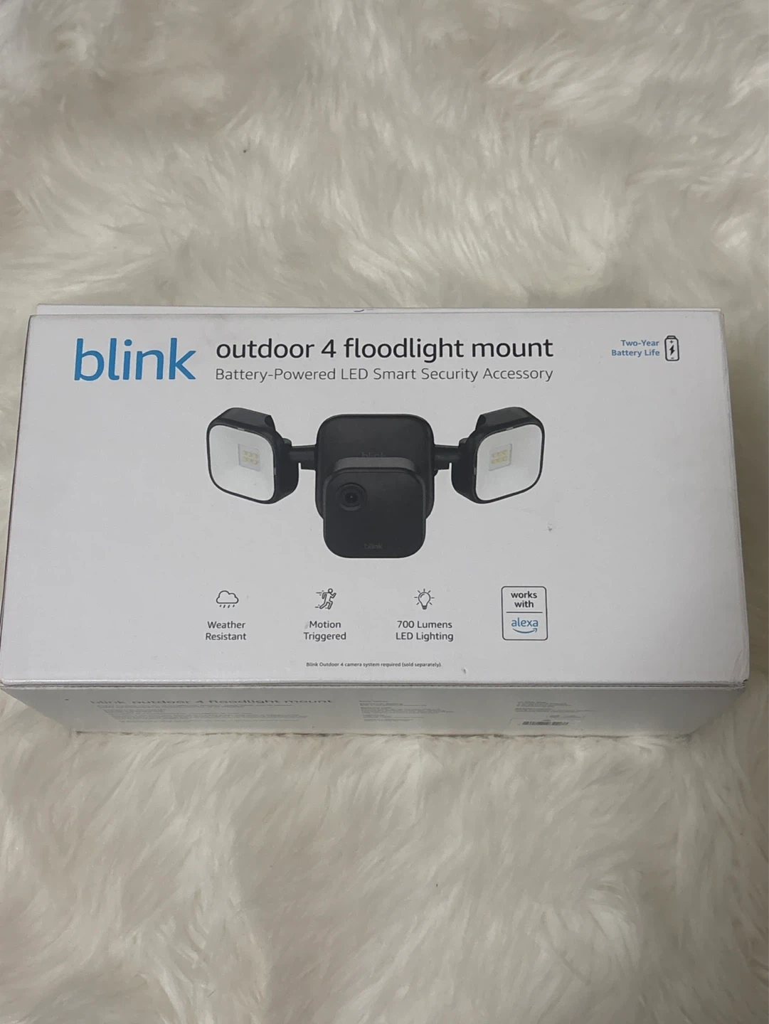 This is a Blink Outdoor 4 Floodlight Mount, a battery-powered LED smart security accessory. It's weather-resistant and motion-triggered, providing 700 lumens of LED lighting. It works with Alexa and is designed for the Blink Outdoor 4 camera system (sold separately).