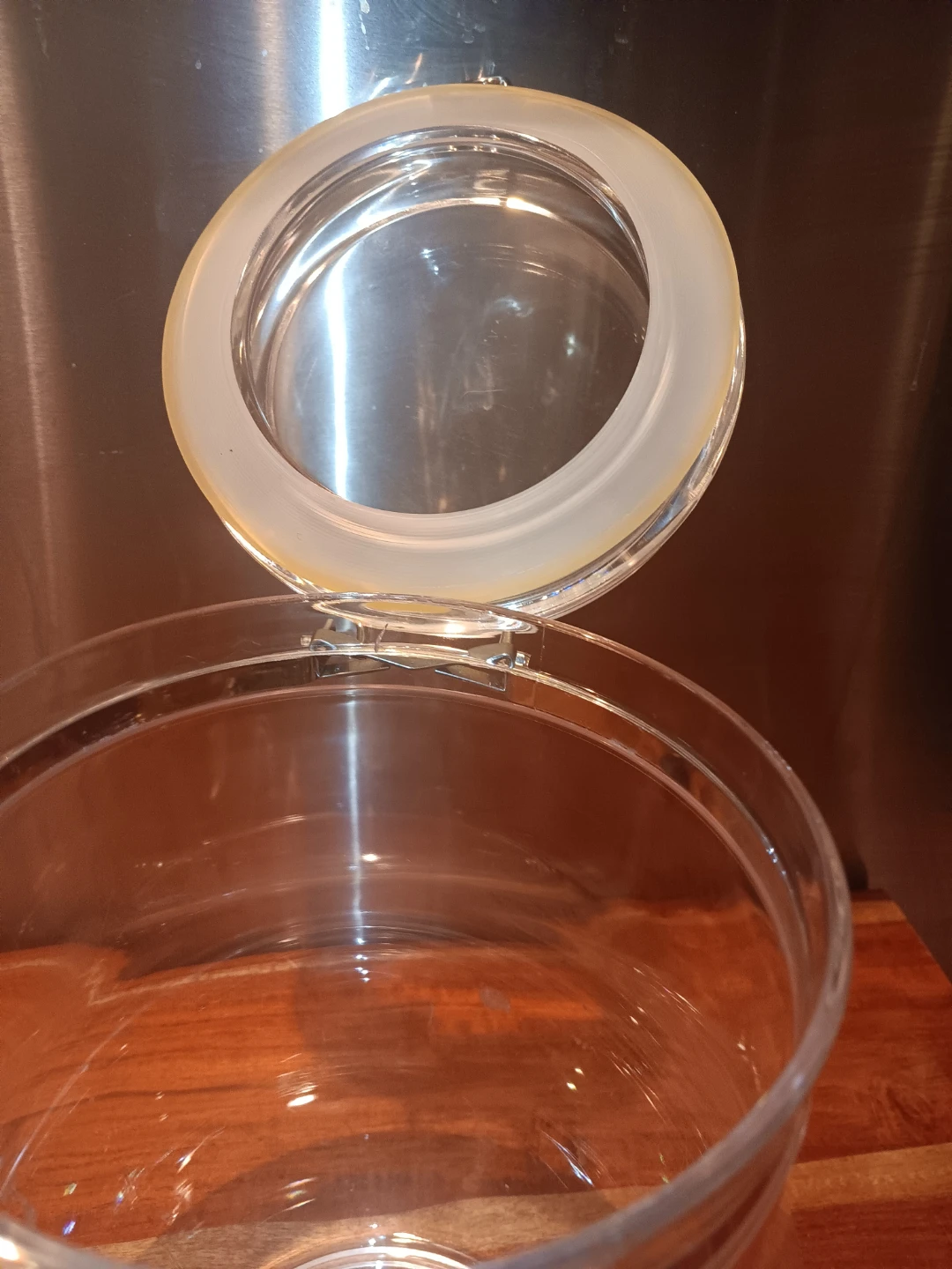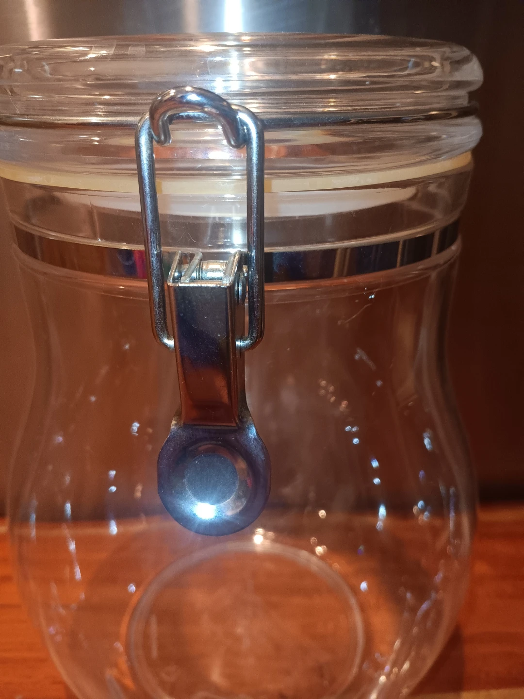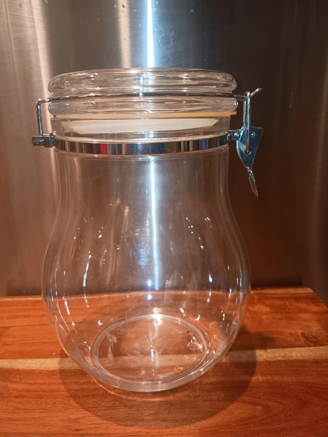 This is a clear glass storage jar with a wire clamp lid and a rubber seal. It's ideal for storing dry goods like coffee, tea, or pantry staples. The jar has a unique shape and a secure closure.