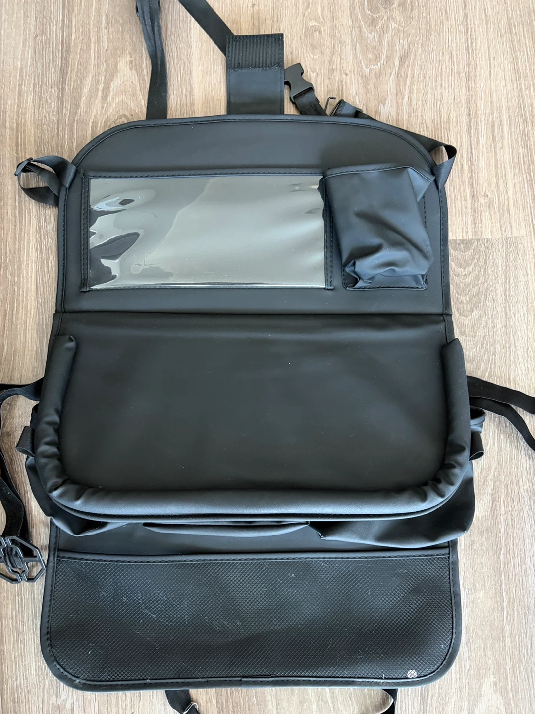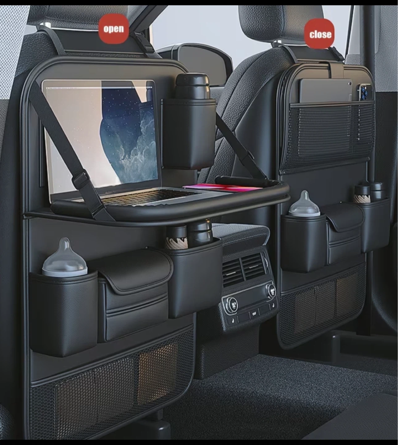 Black car seat back organizer with foldable dinning table, tissue holder and a clear tablet holder. Keeps your car tidy and essentials within reach. Durable material for long-lasting use.