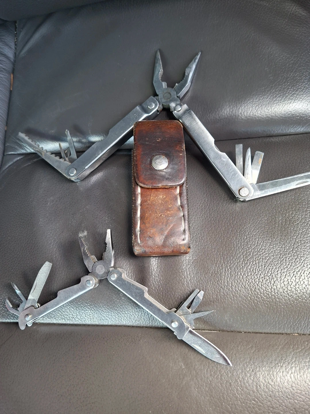 This multi-tool set includes a pair of pliers with multiple folding tools, such as a knife, file, and screwdrivers. It comes with a brown leather sheath for storage. Great for quick repairs and handy tasks!