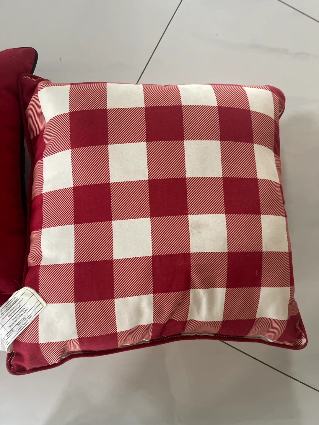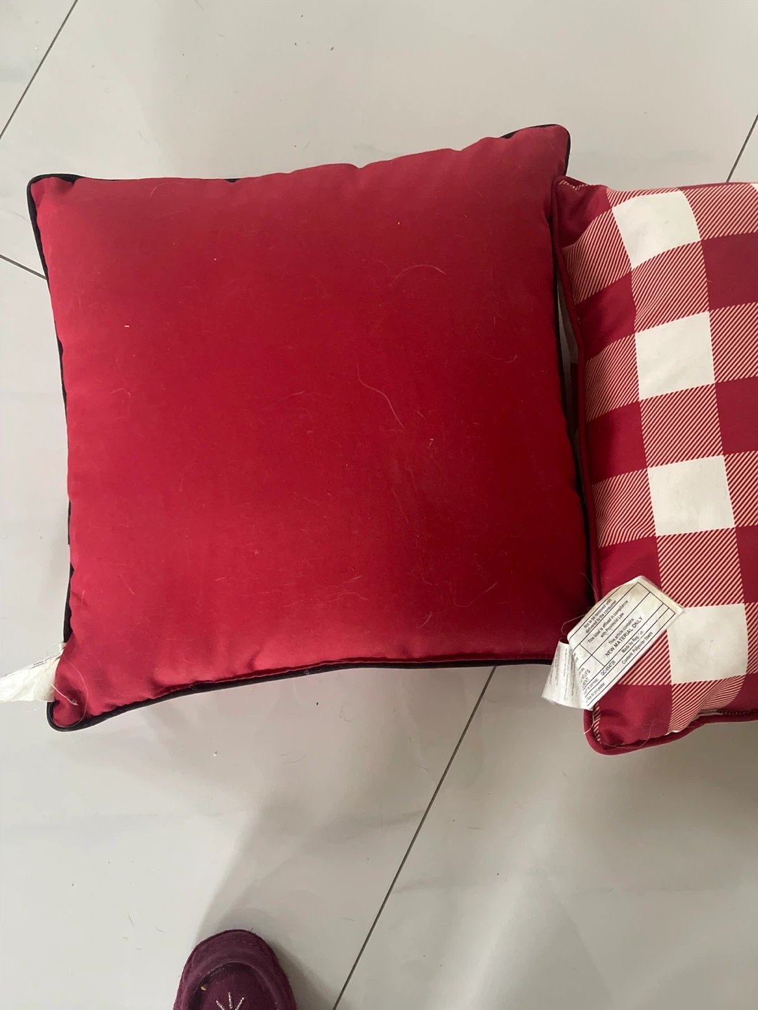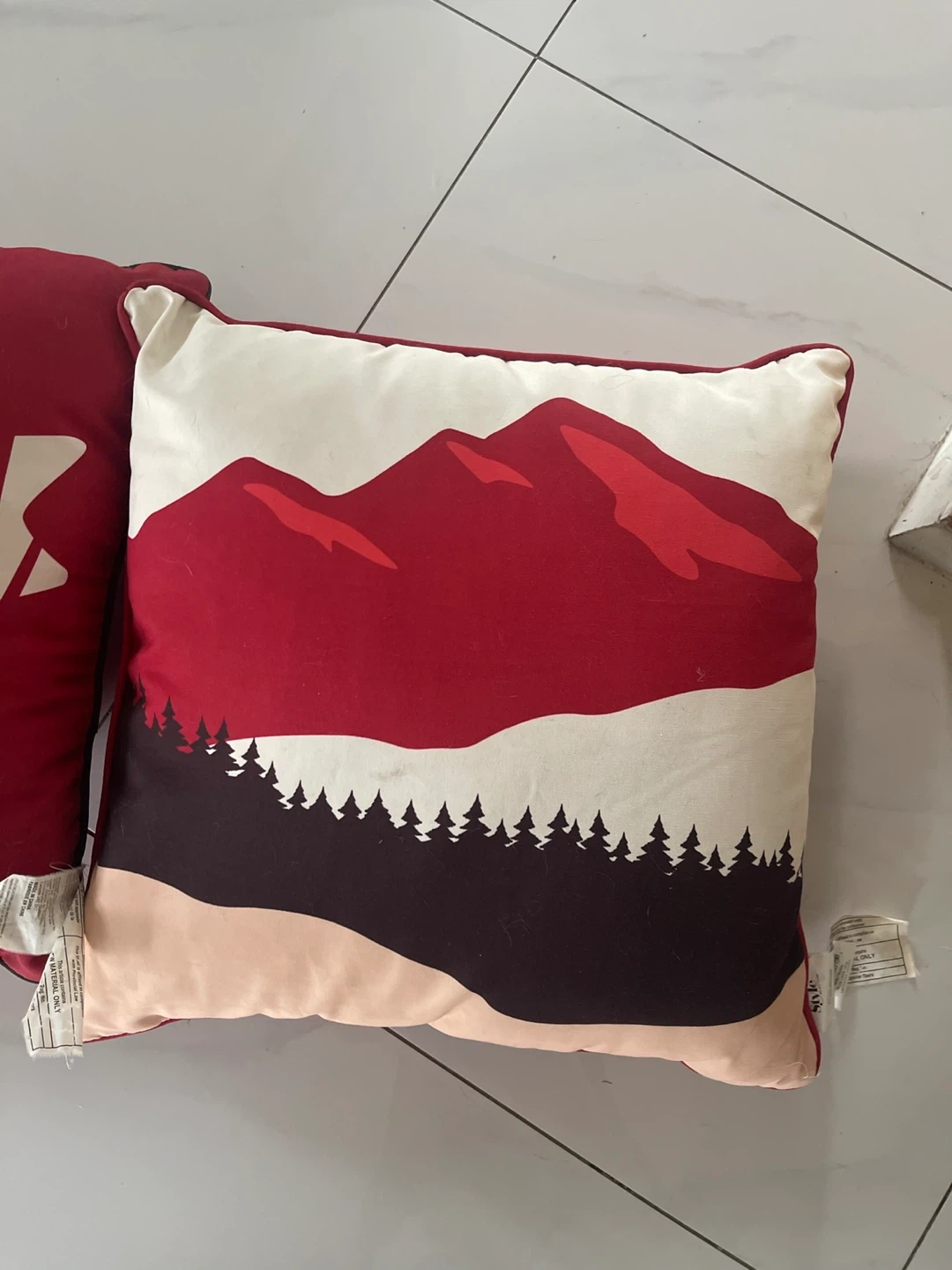 Set of two decorative out door throw pillows. One features a red and white buffalo check pattern, with the front displaying a mountain and forest scene. The other has a maple leaf front and a plain red back. Both are roughly square in shape and add a cozy touch to any room. These pillows are great for adding a pop of colour and pattern to your sofa or chairs!