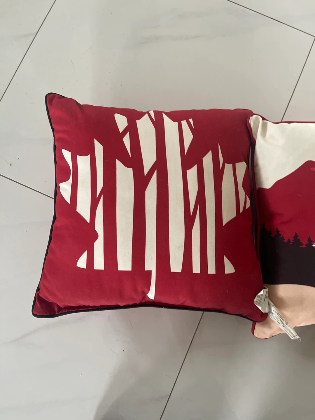Set of two decorative out door throw pillows. One features a red and white buffalo check pattern, with the front displaying a mountain and forest scene. The other has a maple leaf front and a plain red back. Both are roughly square in shape and add a cozy touch to any room. These pillows are great for adding a pop of colour and pattern to your sofa or chairs!