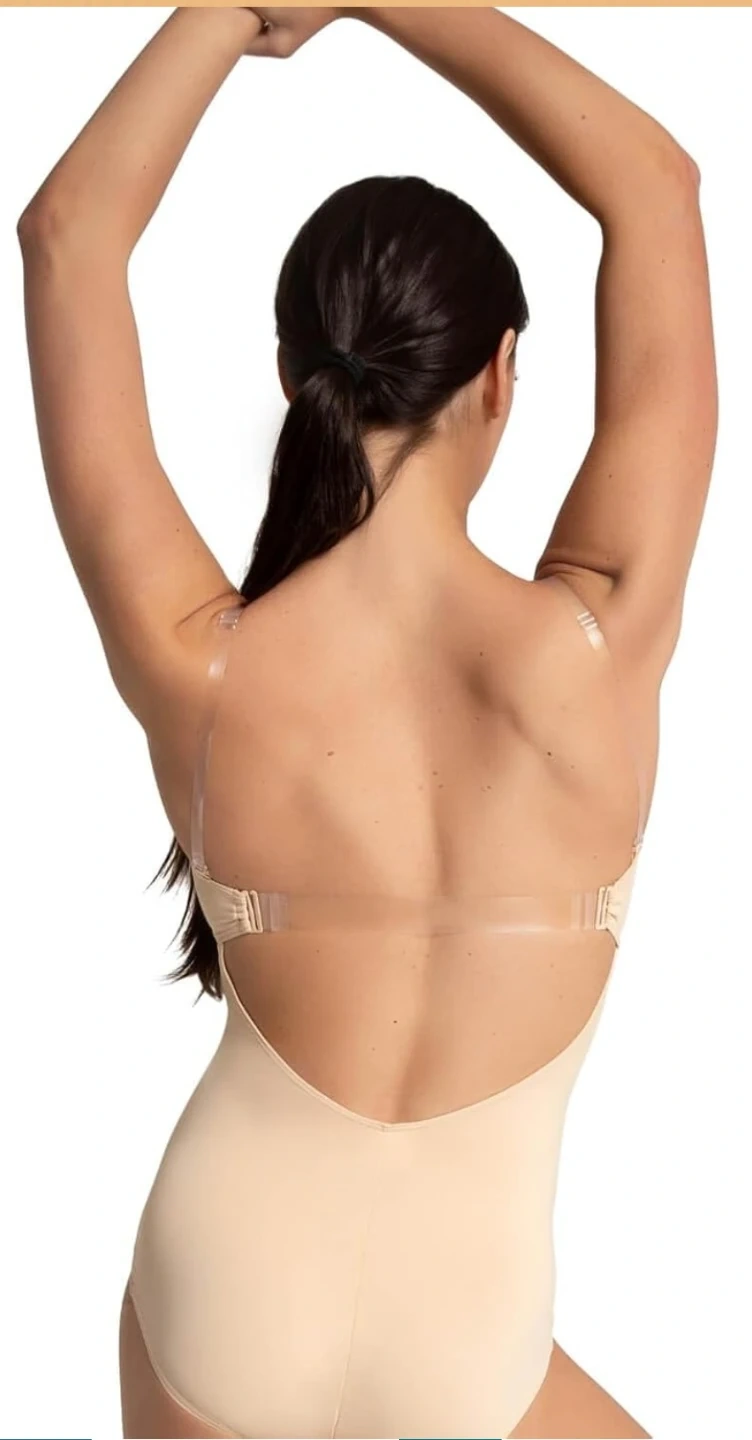 Stretchy, form-fitting beige leotard designed for dance and performance. Features adjustable clear TPU shoulder straps and a low scoop back for a discreet look under costumes.
