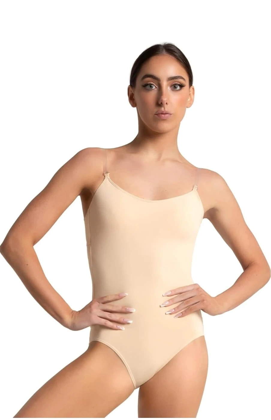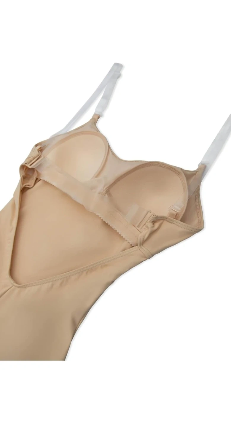 Stretchy, form-fitting beige leotard designed for dance and performance. Features adjustable clear TPU shoulder straps and a low scoop back for a discreet look under costumes.