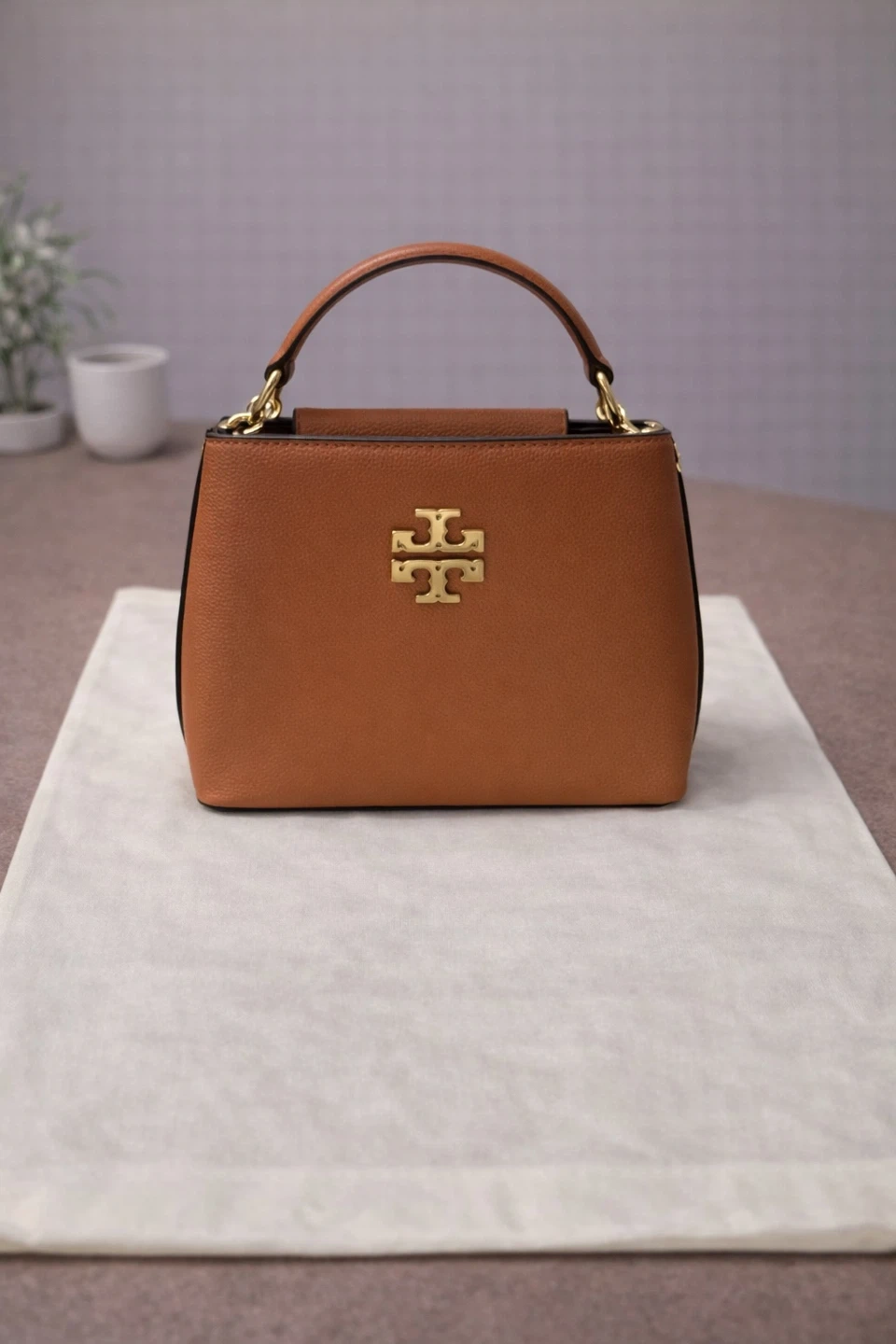 This handbag in a rich tan colour. It's made of textured leather with gold-tone hardware. This bag features the iconic logo prominently on the front. It has a top handle and a detachable strap for versatility.