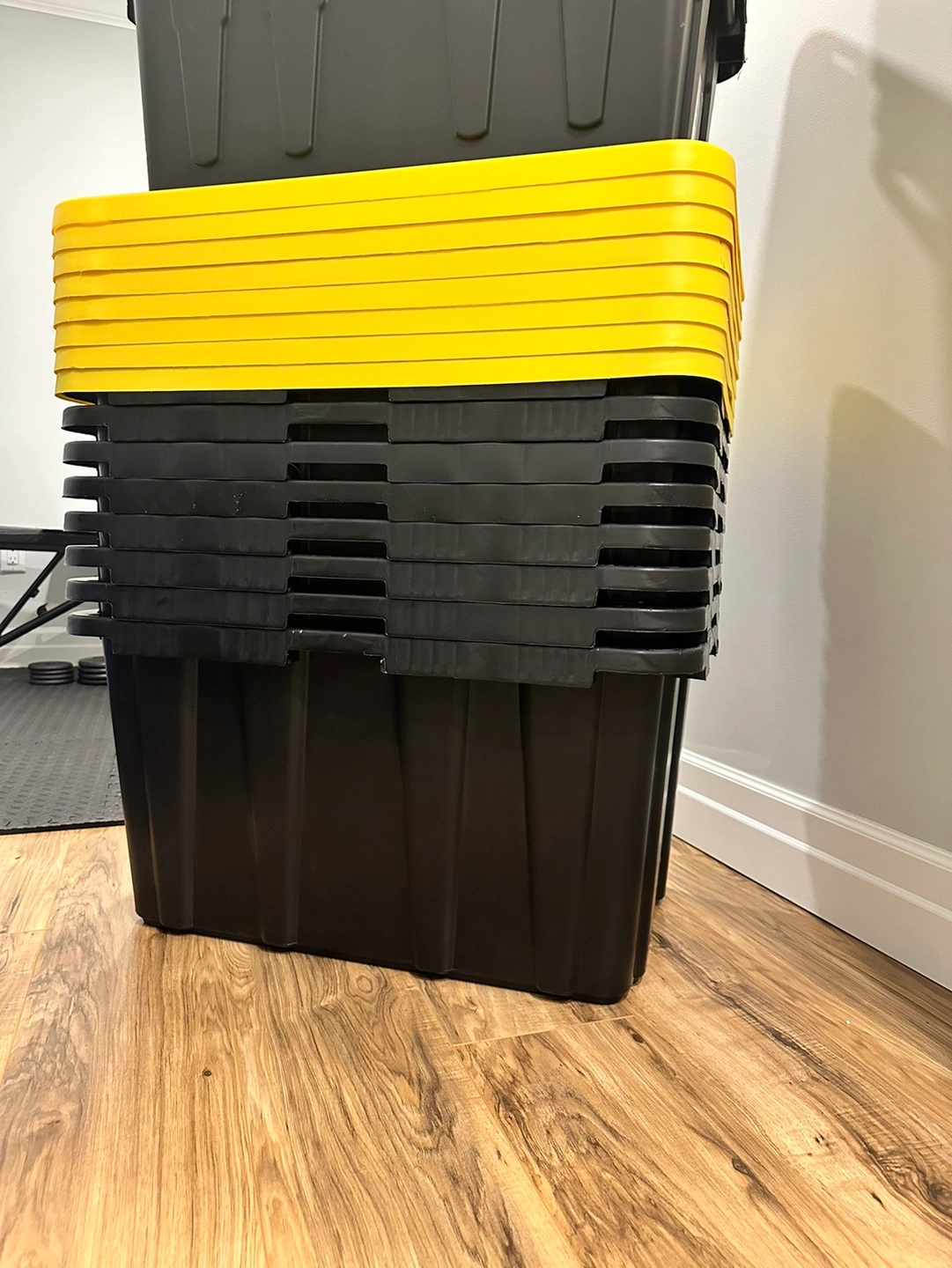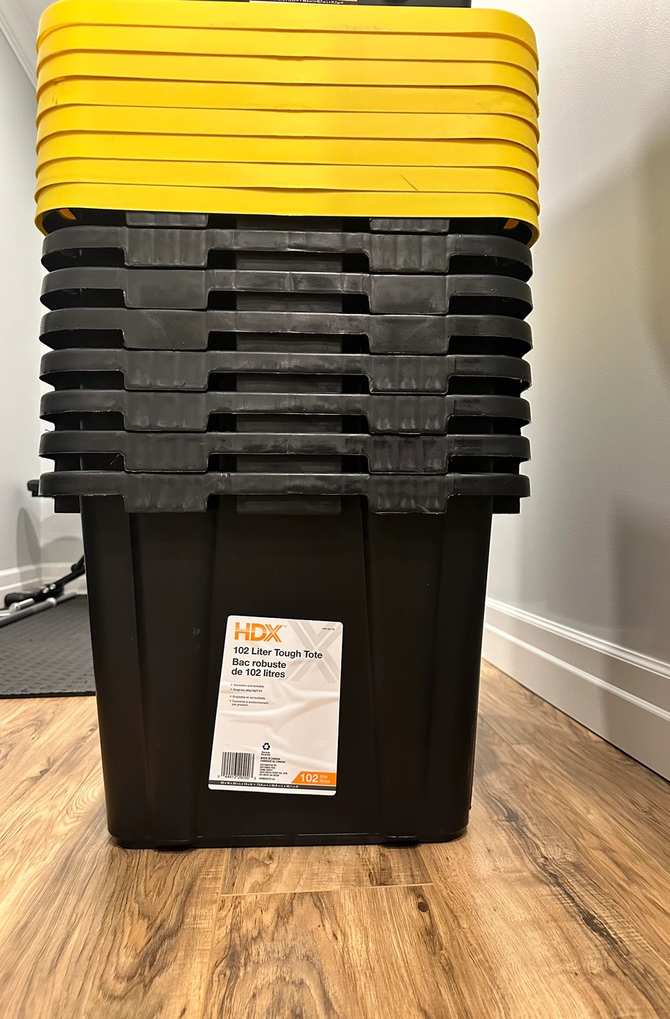 This HDX reinforced stackable 102L heavy-duty tough tote will handle any storage job ranging from general storage needs to extreme storage jobs. The tote includes a black base made from durable recycled polypropylene and a yellow reinforced snap-fit lid to secure and protect your valuables. This tote is a perfect option for the meticulous organizer who demands the very best in heavy-duty storage and protection. Integrated slots make the tote lockable to keep away unwanted intruders. This tote includes innovative tie-down channels that allow it to be easily strapped down for simple transportation and fits most Hitch Mounted Cargo Carriers.
