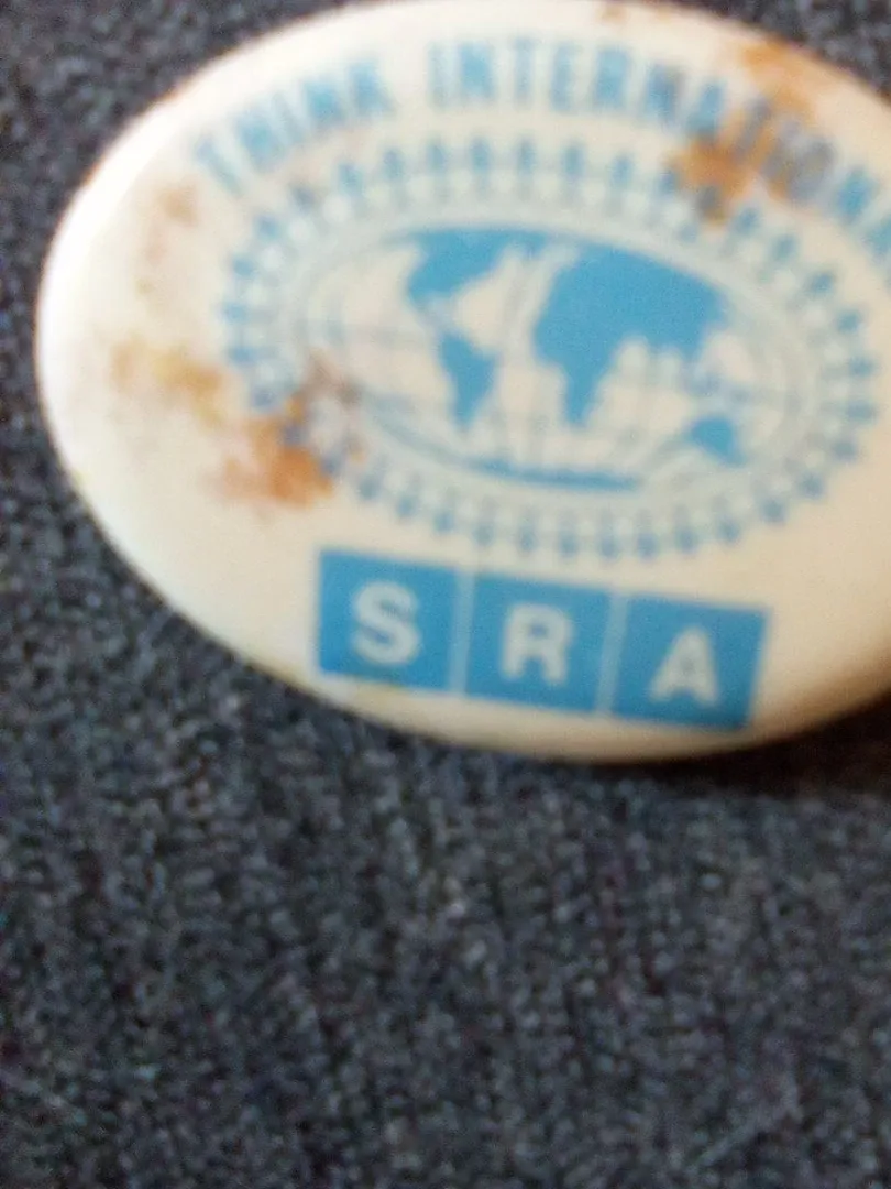 This is a THINK INTERNATIONAL SRA pin. It's a white and blue design featuring a globe and the letters SRA. It's a small promotional item.