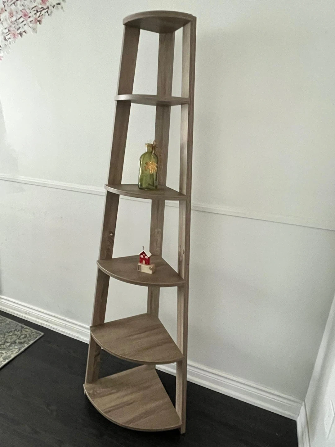 This is a wooden corner shelf unit with five tiers. It's a nice neutral brown wood tone. It's great for displaying books or decorative items!