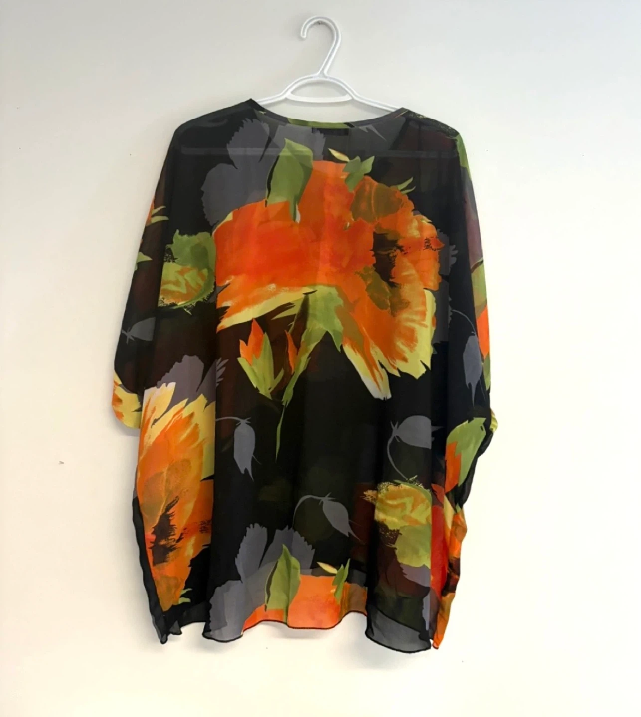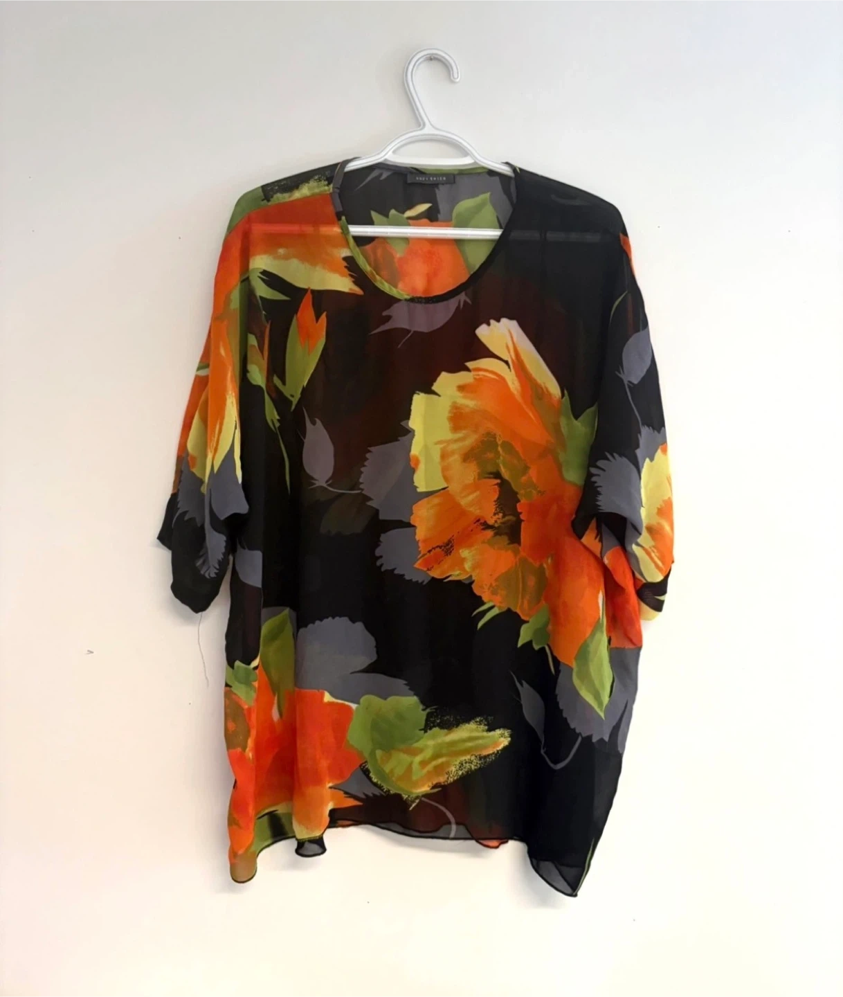 A sheer black blouse with a bold orange, yellow, and green floral print.