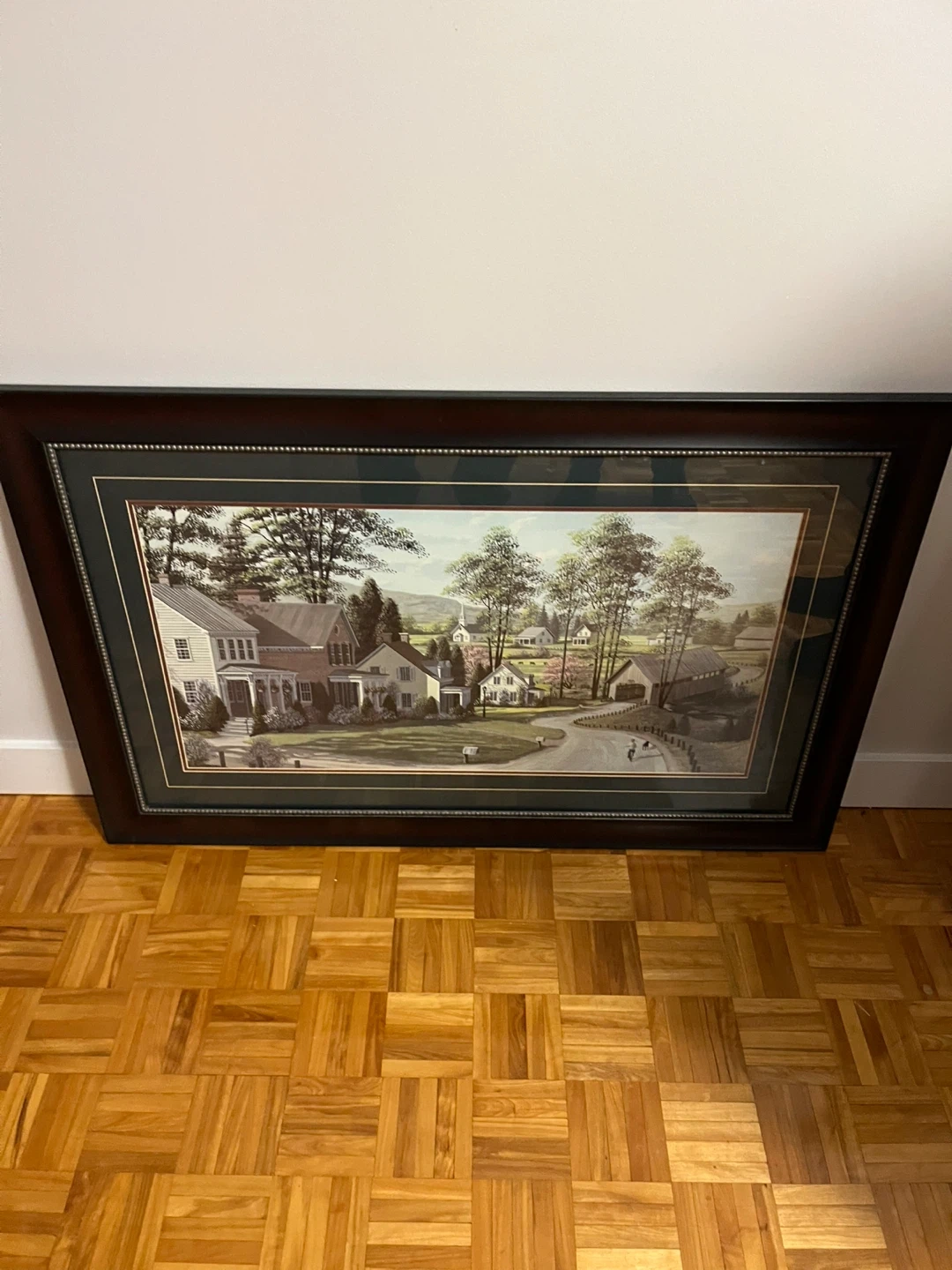 This is a framed art print depicting a charming rural landscape with houses and trees. It features a dark wood frame with decorative trim. The scene includes a white farmhouse, a covered bridge, and a winding road.