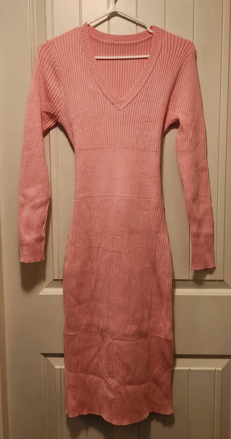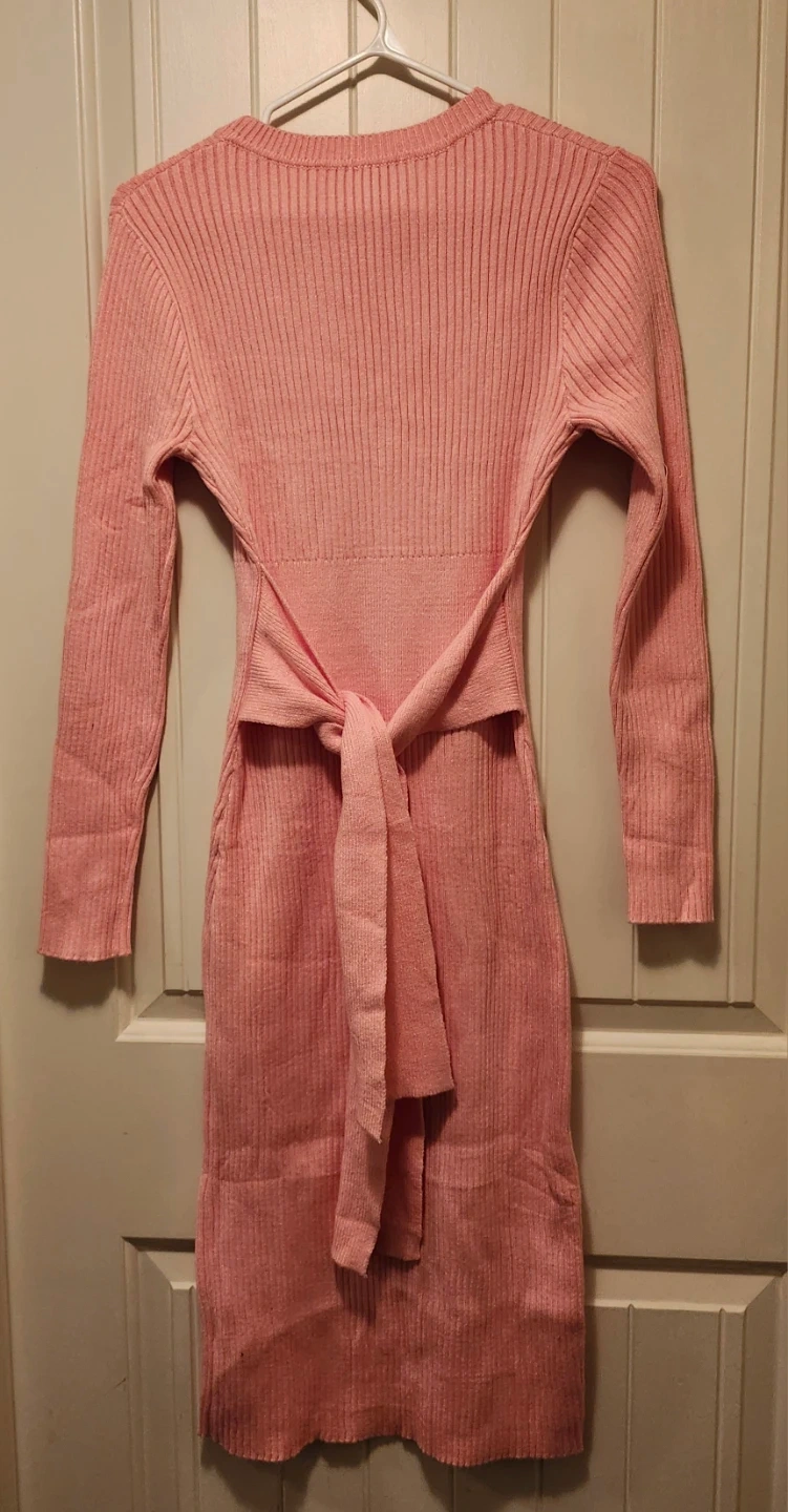 This is a cozy pink ribbed knit midi dress. It features a flattering V-neckline and a tie belt at the waist for a customizable fit. The long sleeves make it perfect for cooler weather.