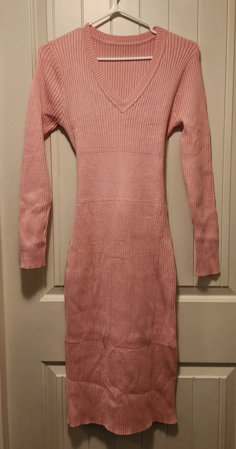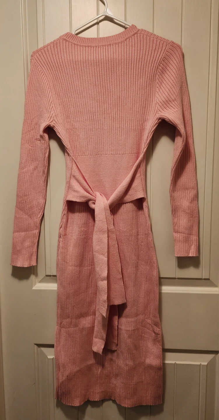This is a cozy pink ribbed knit midi dress. It features a flattering V-neckline and a tie belt at the waist for a customizable fit. The long sleeves make it perfect for cooler weather.