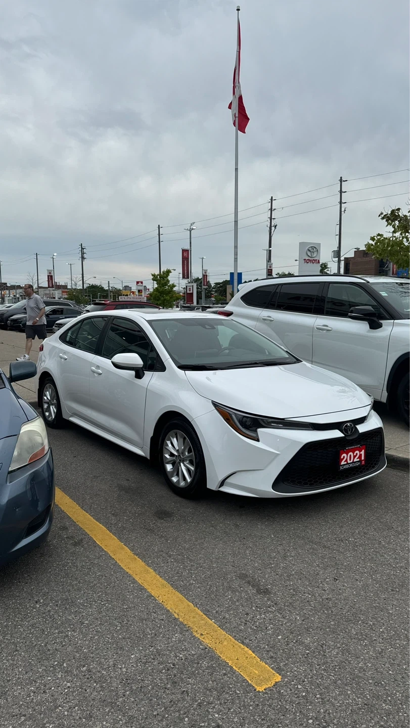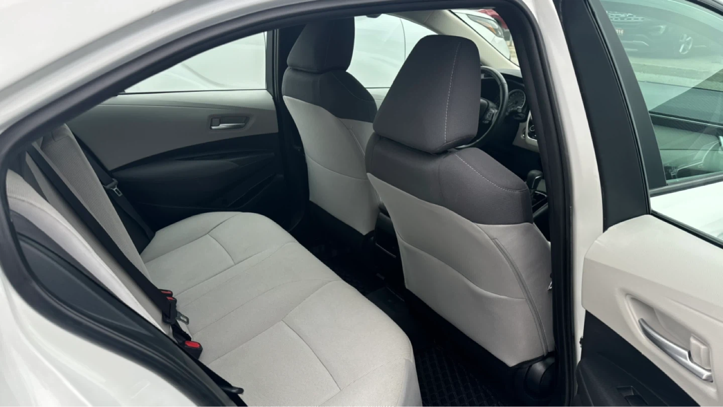 White Toyota Corolla LE sedan. Interior features light grey and black fabric seats with a sunroof. This compact car offers a comfortable ride for daily commutes.
