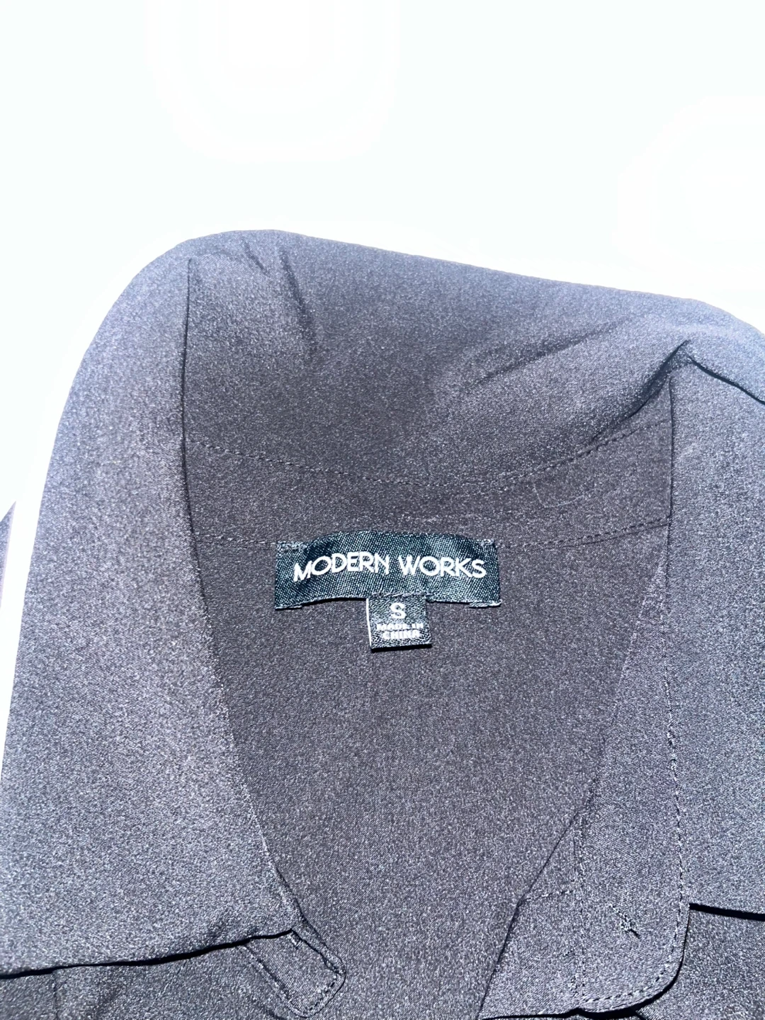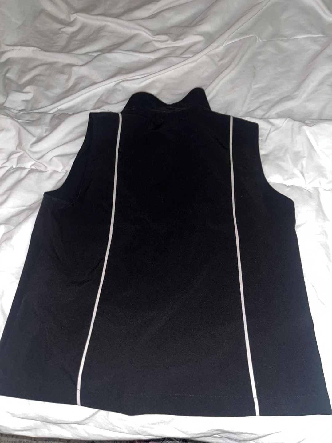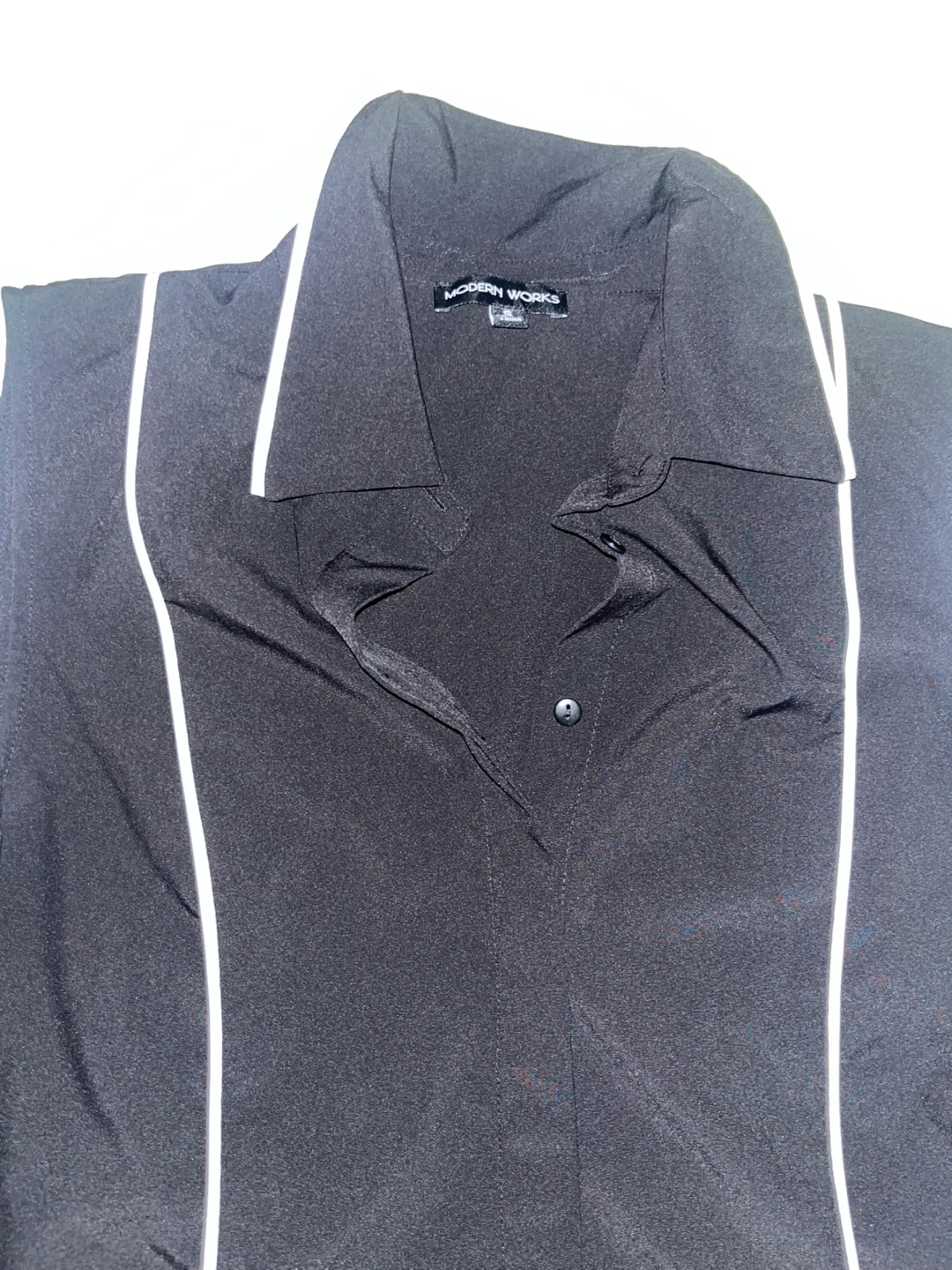 A stylish black sleeveless shirt from Modern Works. It features a collared neckline with a button-up front and contrasting white piping detail along the seams. The size is small.