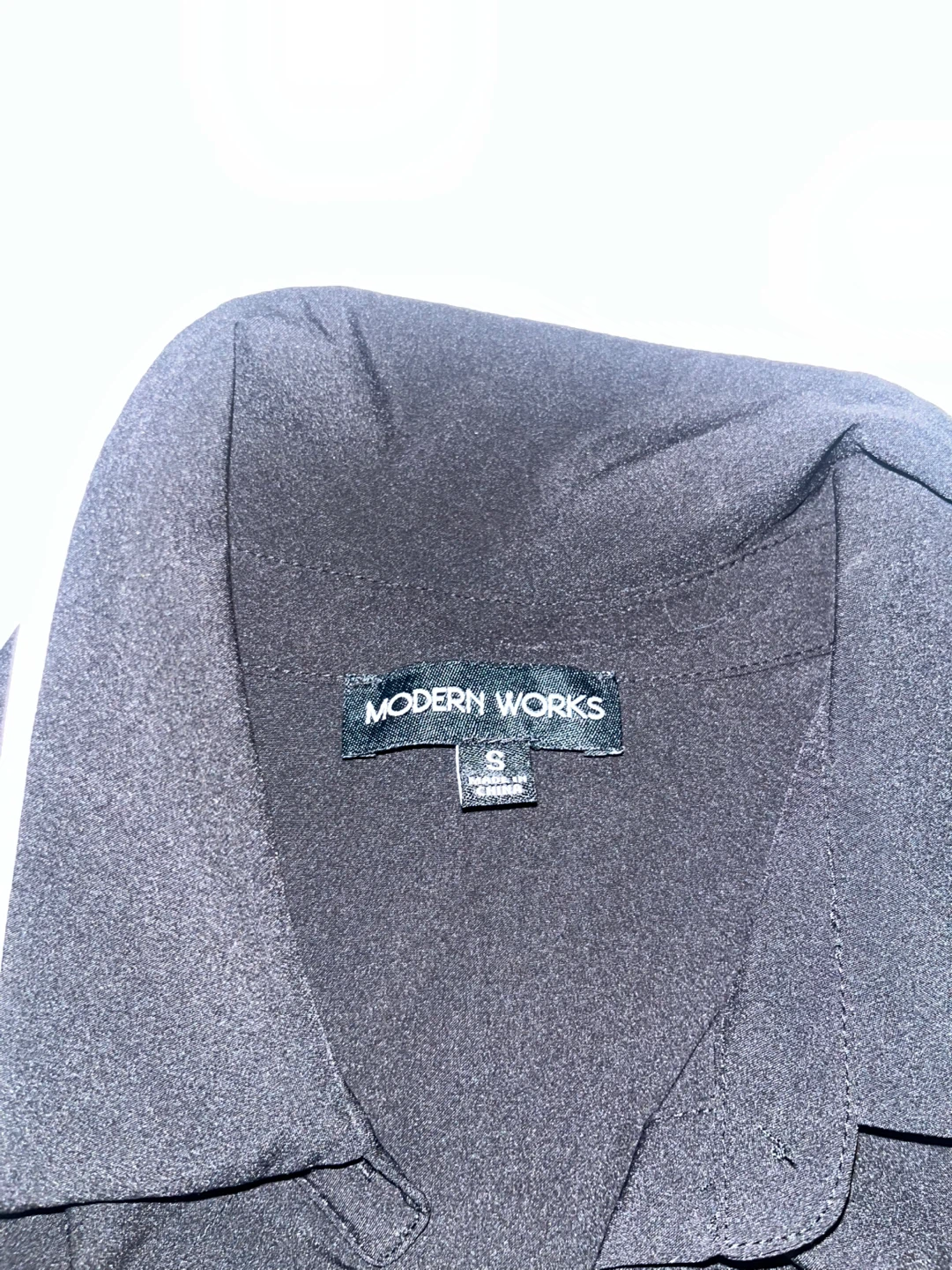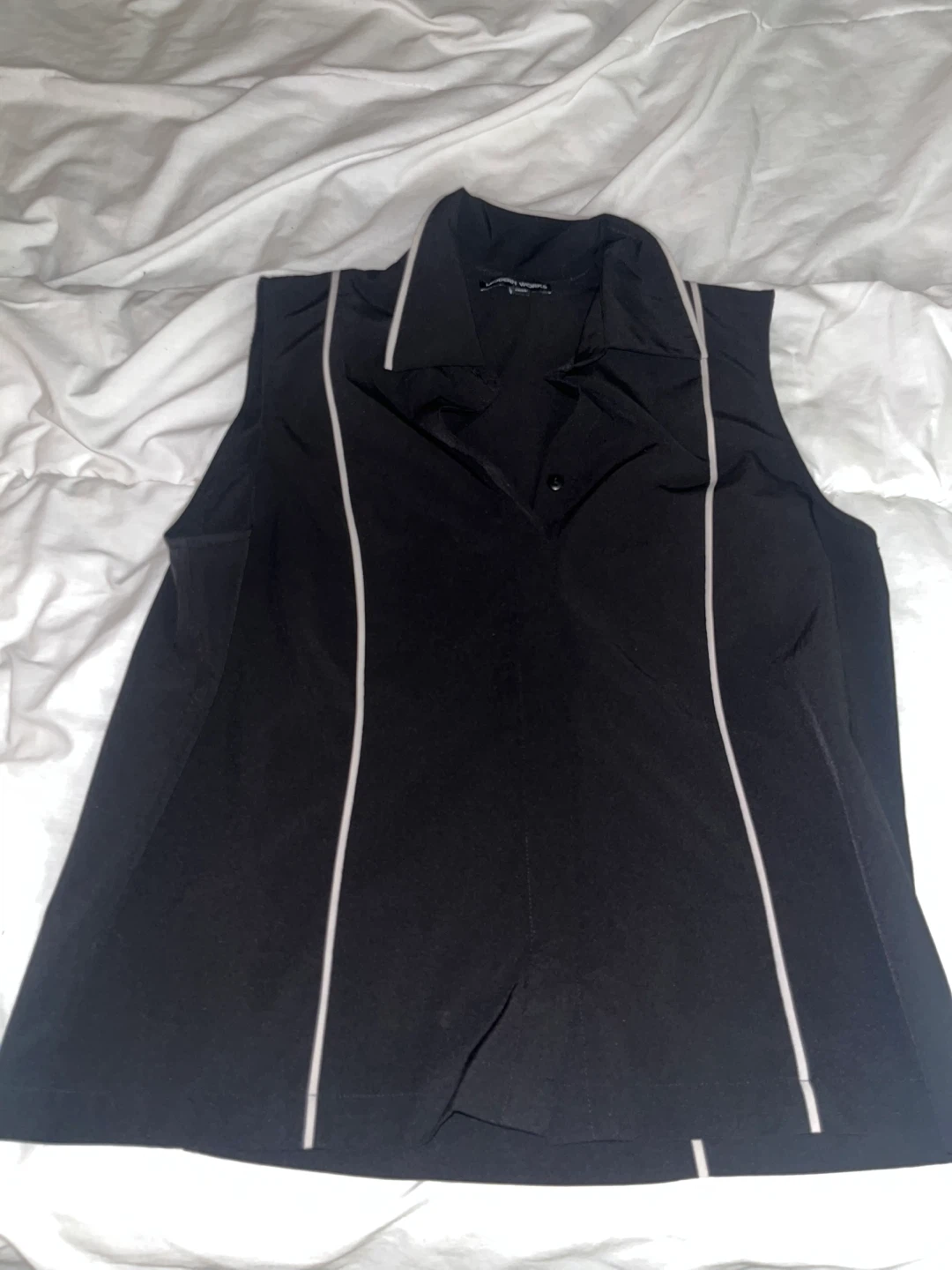 A stylish black sleeveless shirt from Modern Works. It features a collared neckline with a button-up front and contrasting white piping detail along the seams. The size is small.