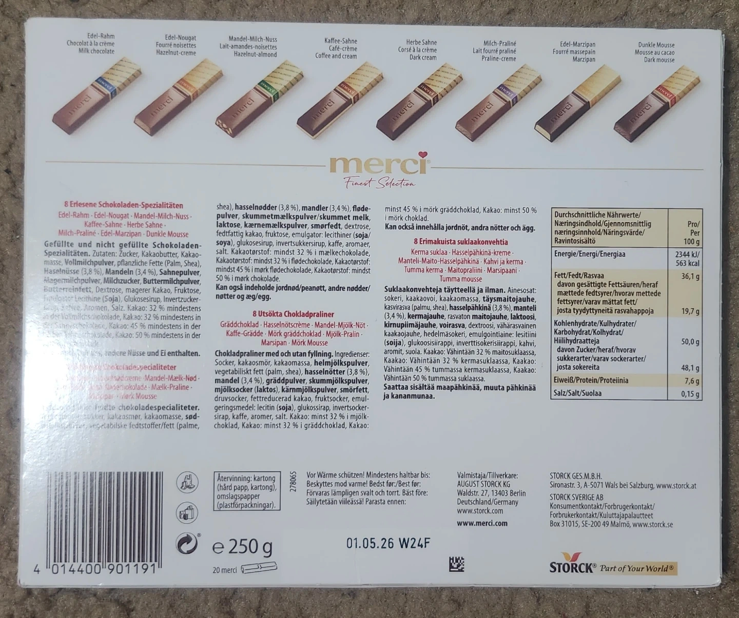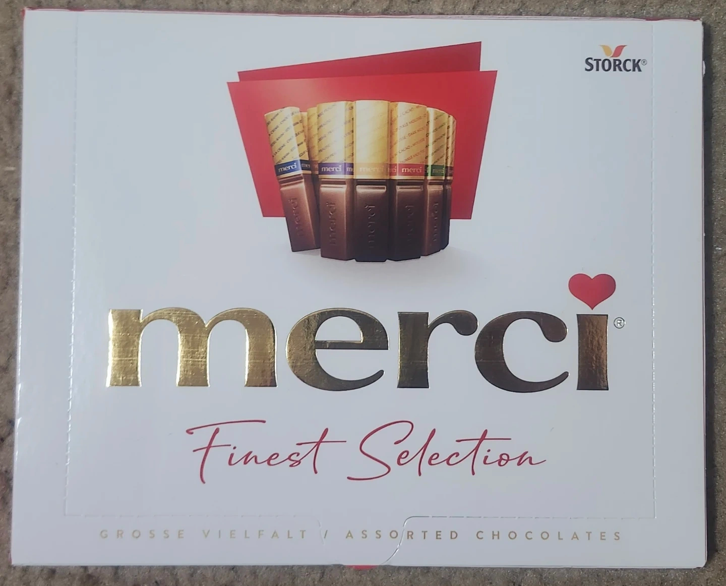 Enjoy a box of Merci Finest Selection assorted chocolates! This box contains a delicious variety of chocolate flavours. Perfect for sharing or enjoying on your own