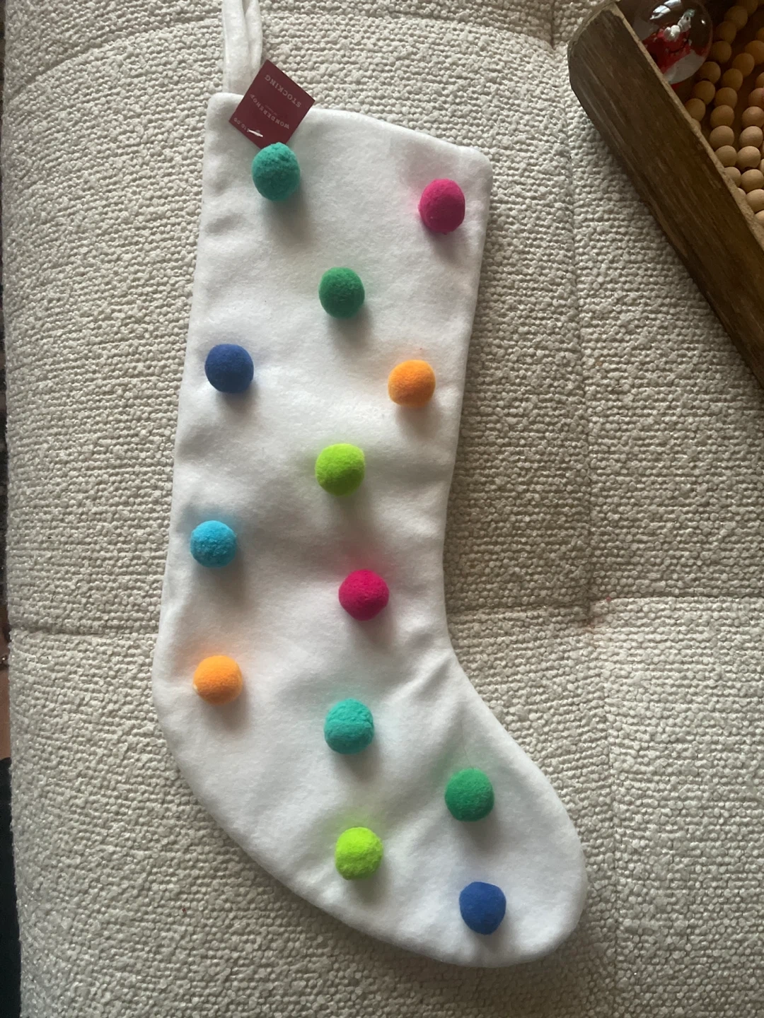 A festive white felt Christmas stocking adorned with colorful pom-poms. This stocking is ready to be filled with holiday goodies! It's perfect for hanging by the fireplace.