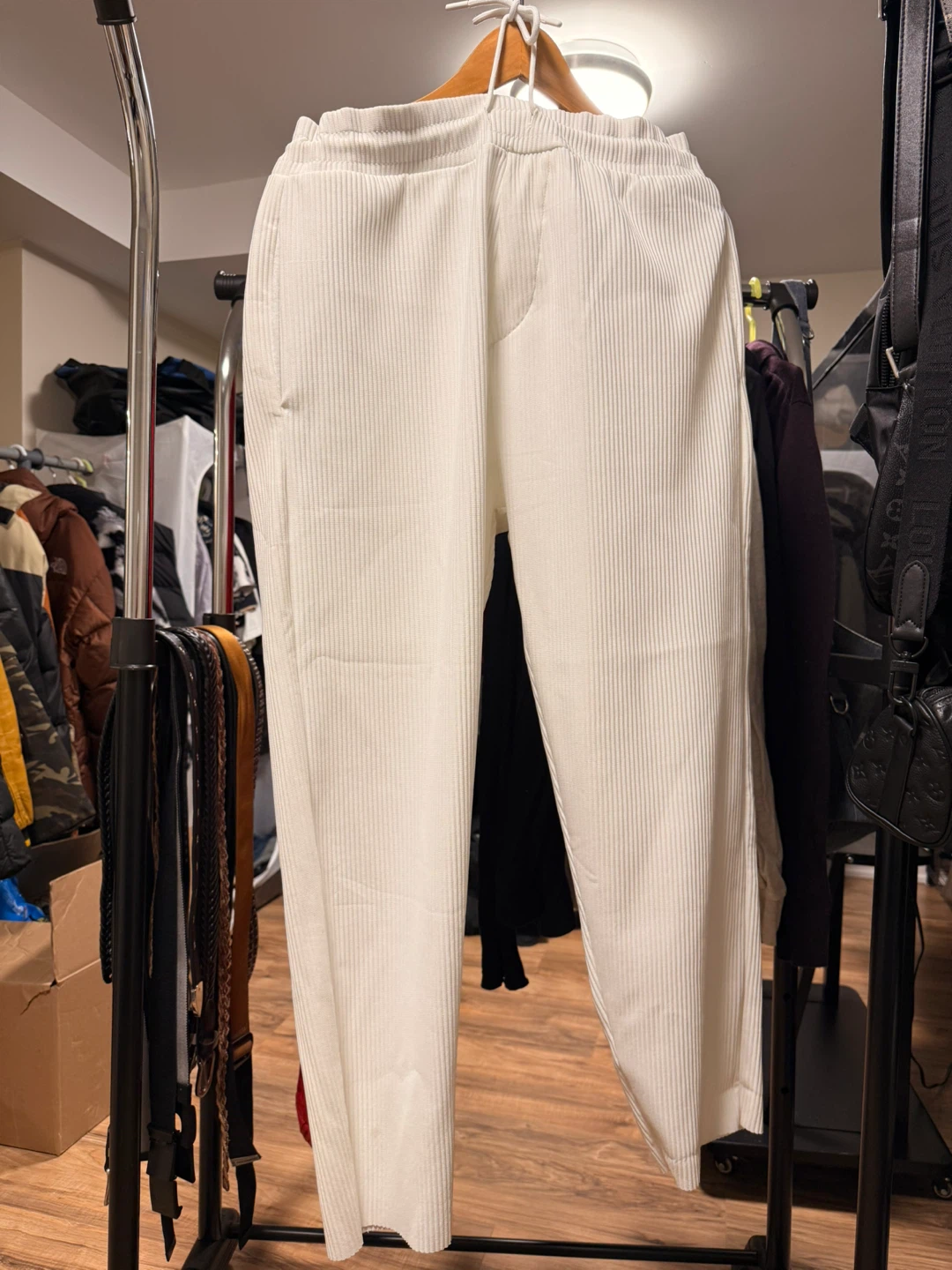 These are white corduroy pants. They're made from a soft fabric with a ribbed texture. Features an elastic waistband for comfort.