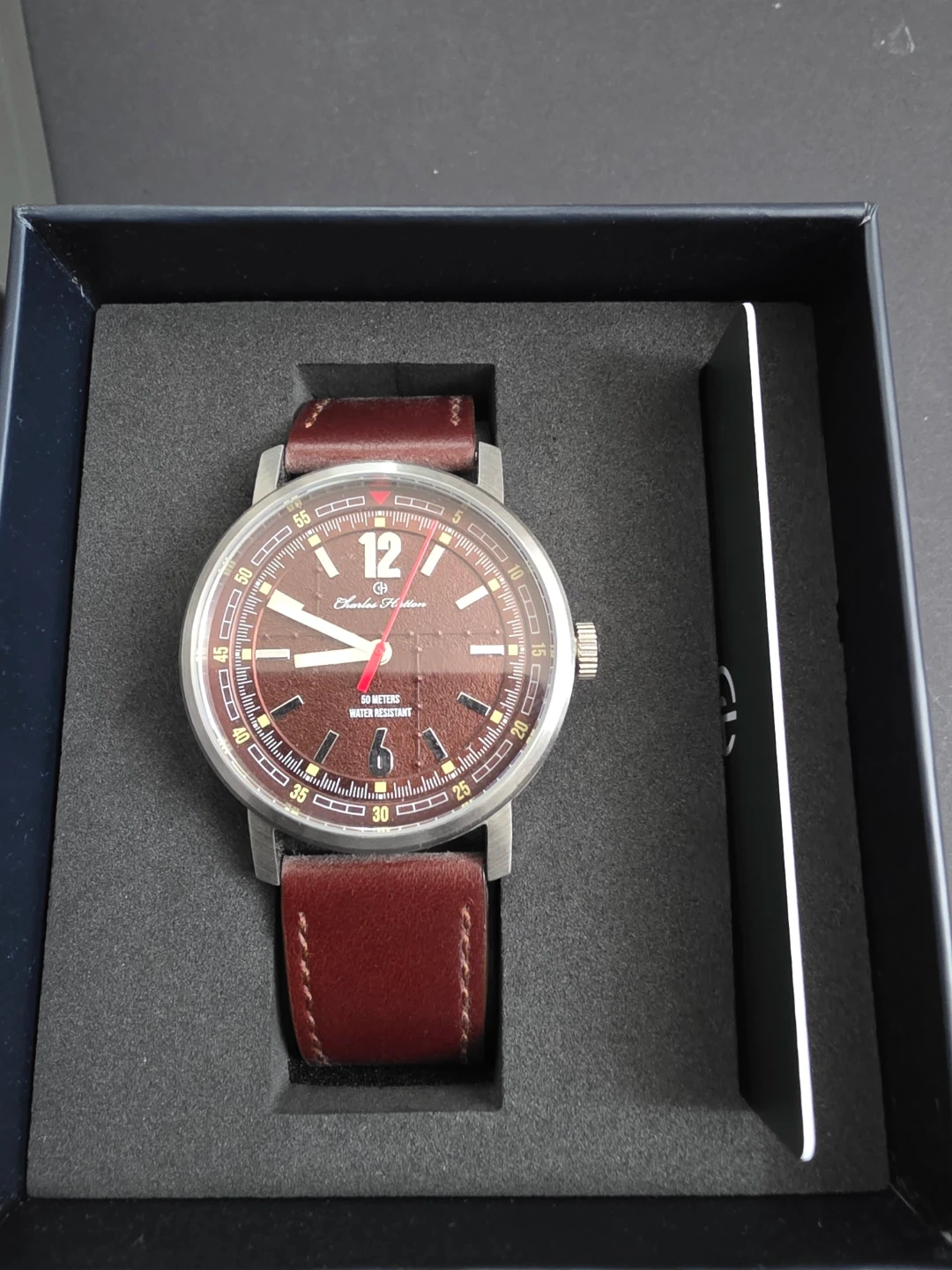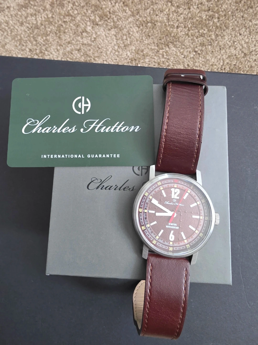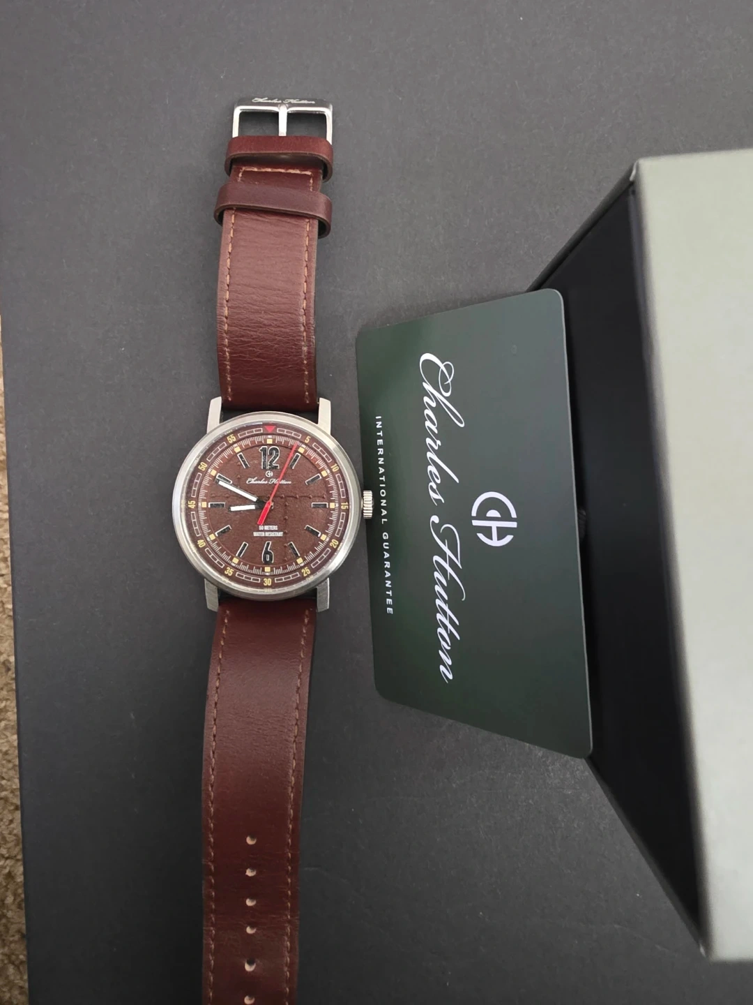 This Charles Hutton watch features a brown dial and a classic brown leather strap. It's water resistant up to 50 meters. Includes original box and international guarantee card.