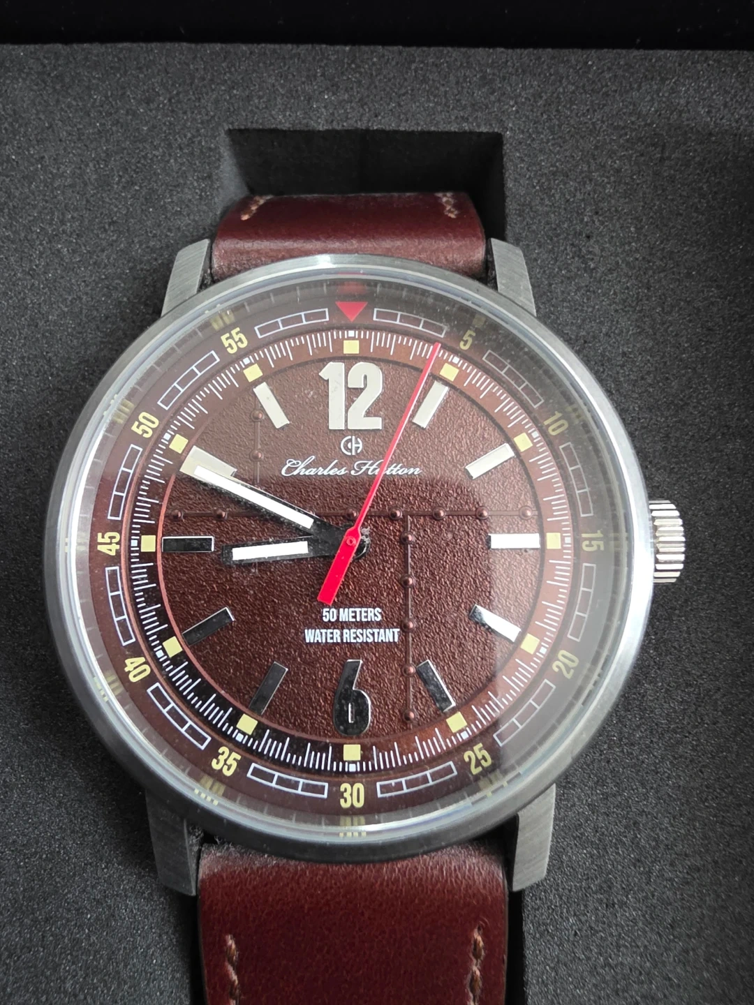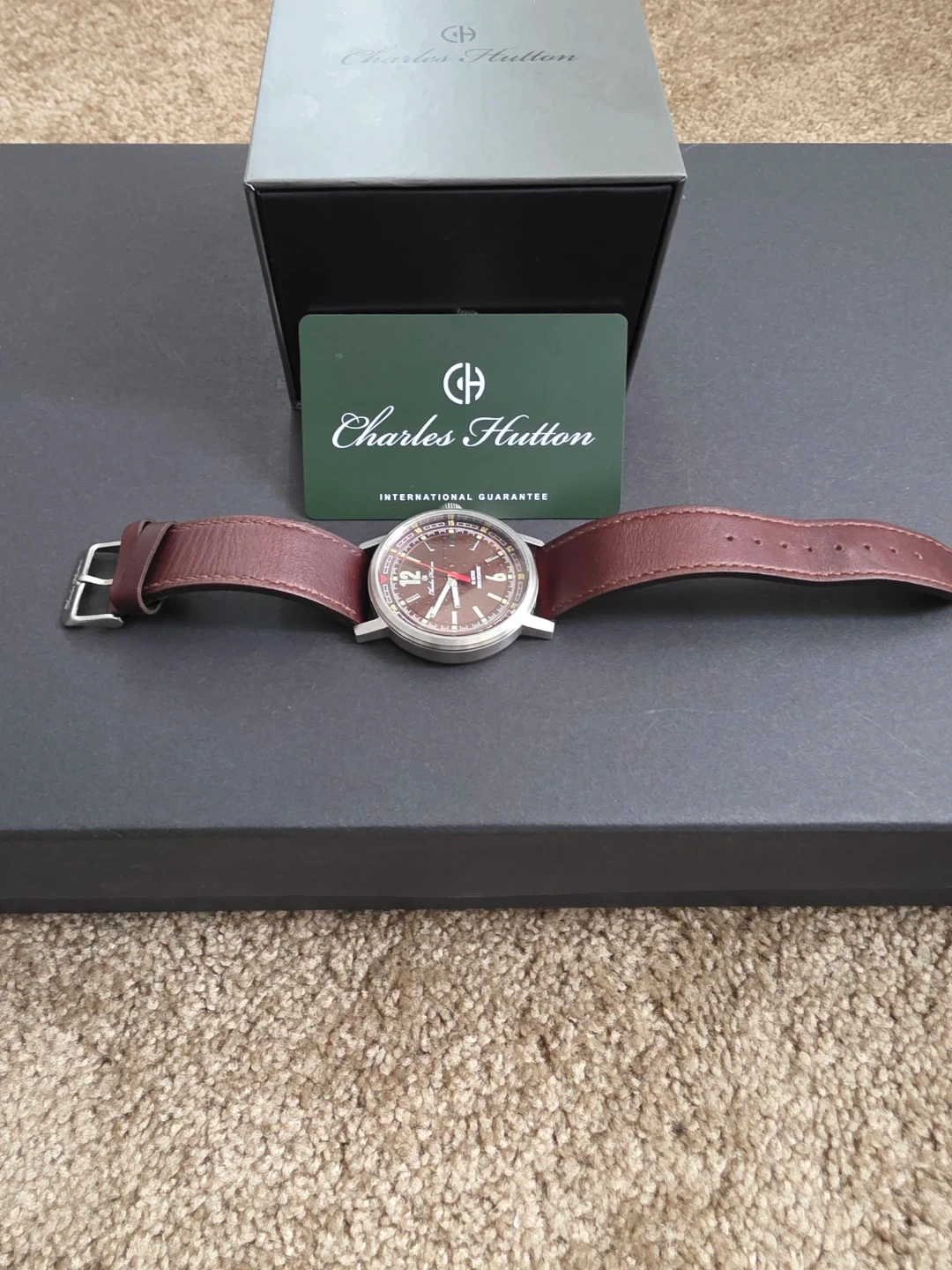This Charles Hutton watch features a brown dial and a classic brown leather strap. It's water resistant up to 50 meters. Includes original box and international guarantee card.