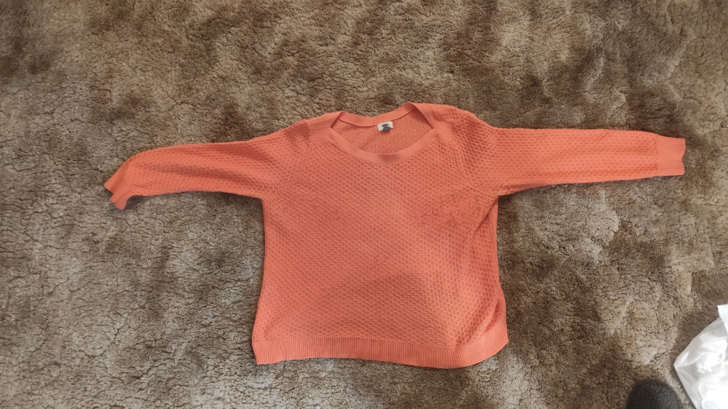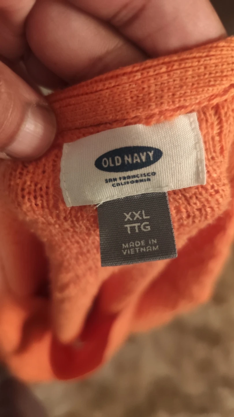 This is an Old Navy v-neck sweater. It's size XXL and a vibrant orange colour. Made in Vietnam.