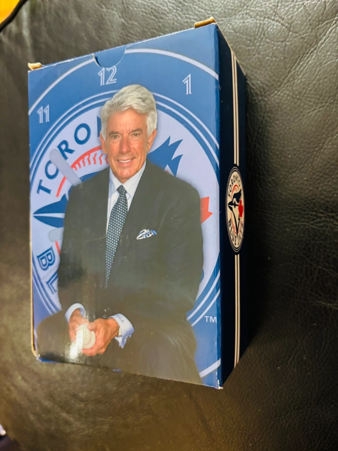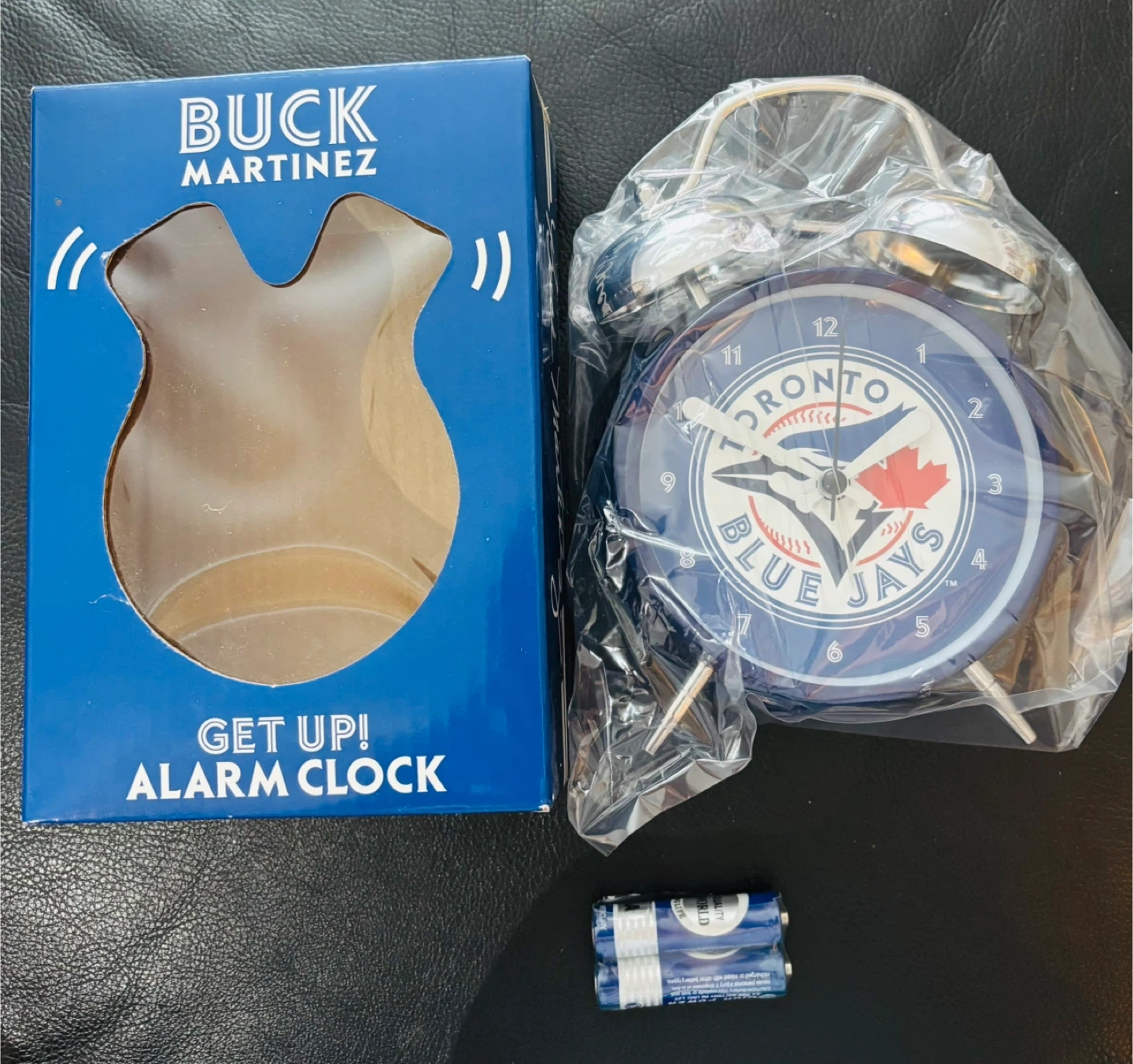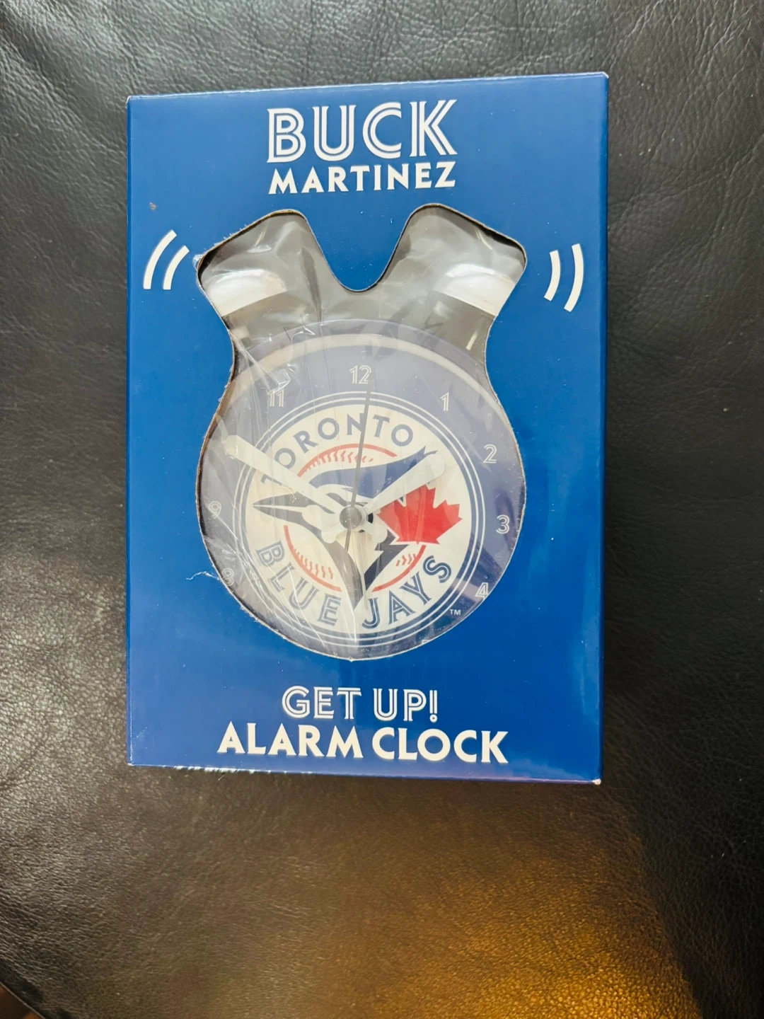 This is a brand new Buck Martinez alarm clock featuring the Toronto Blue Jays logo. Batteries included.