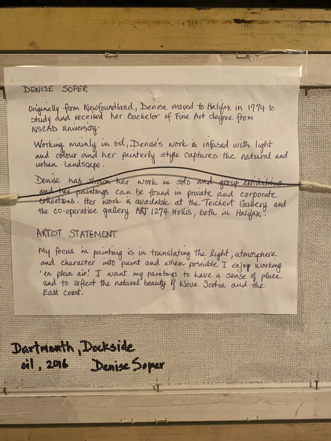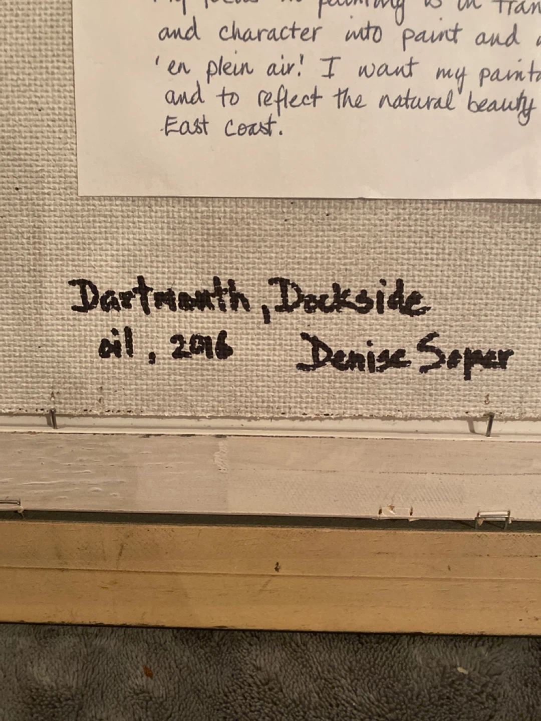 Selling an original oil painting by Denise Soper titled "Dartmouth, Dockside" created in 2016. It captures the natural beauty of Nova Scotia and the East Coast. Denise's work is infused with light and colour. Her paintings can be found in private and corporate collections and is available at the Teichert Gallery and the co-operative gallery ART 1274 Hollis, both in Halifax
