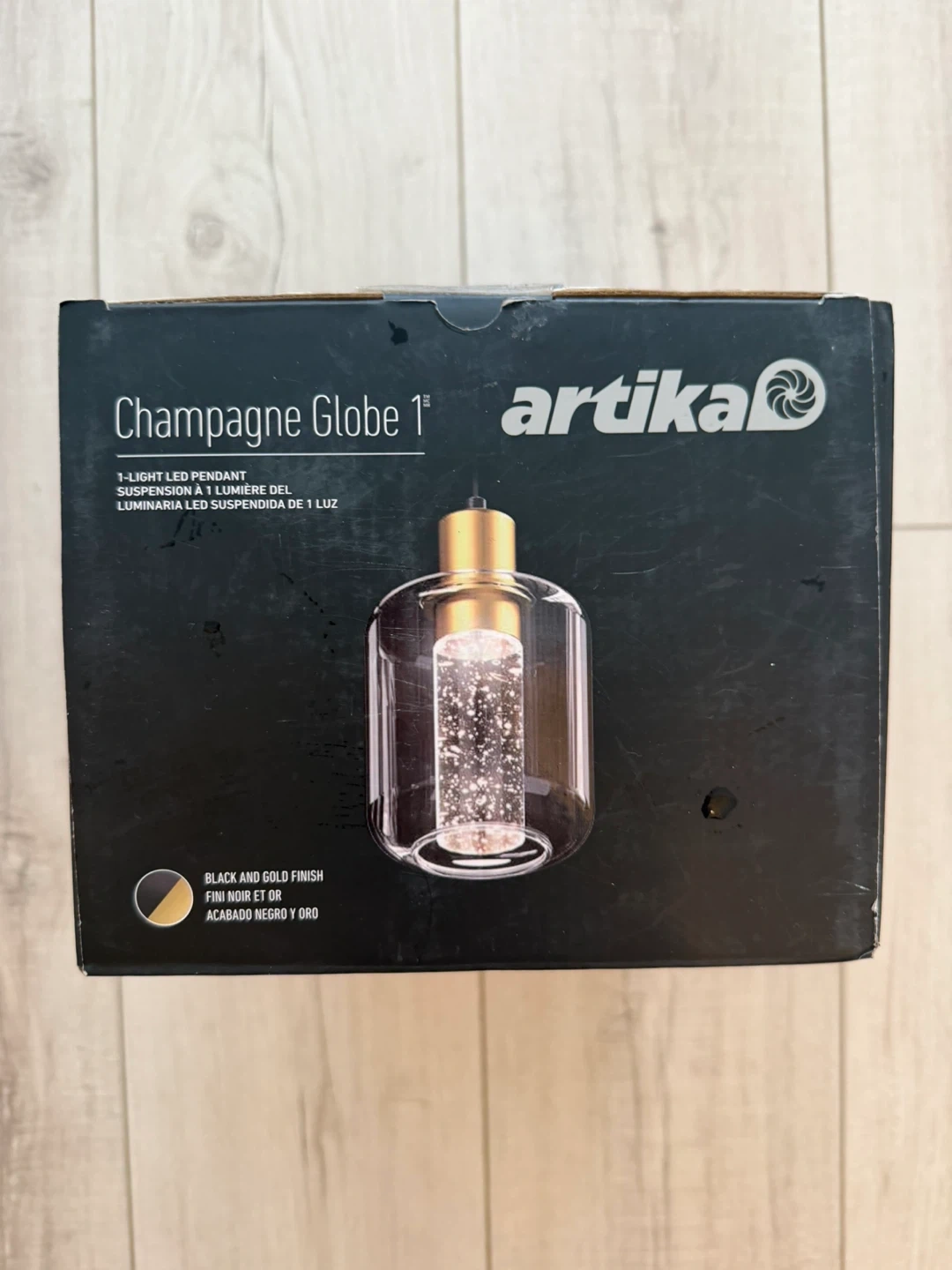This is an Artika Champagne Globe 1-light LED pendant light. It features a black and gold finish. Includes original packaging.