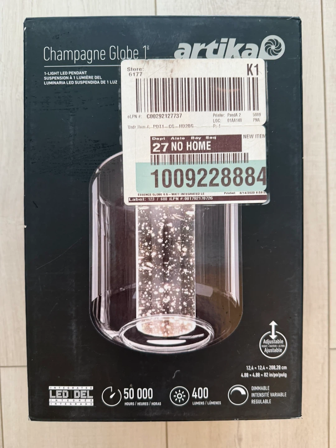 This is an Artika Champagne Globe 1-light LED pendant light. It features a black and gold finish. Includes original packaging.