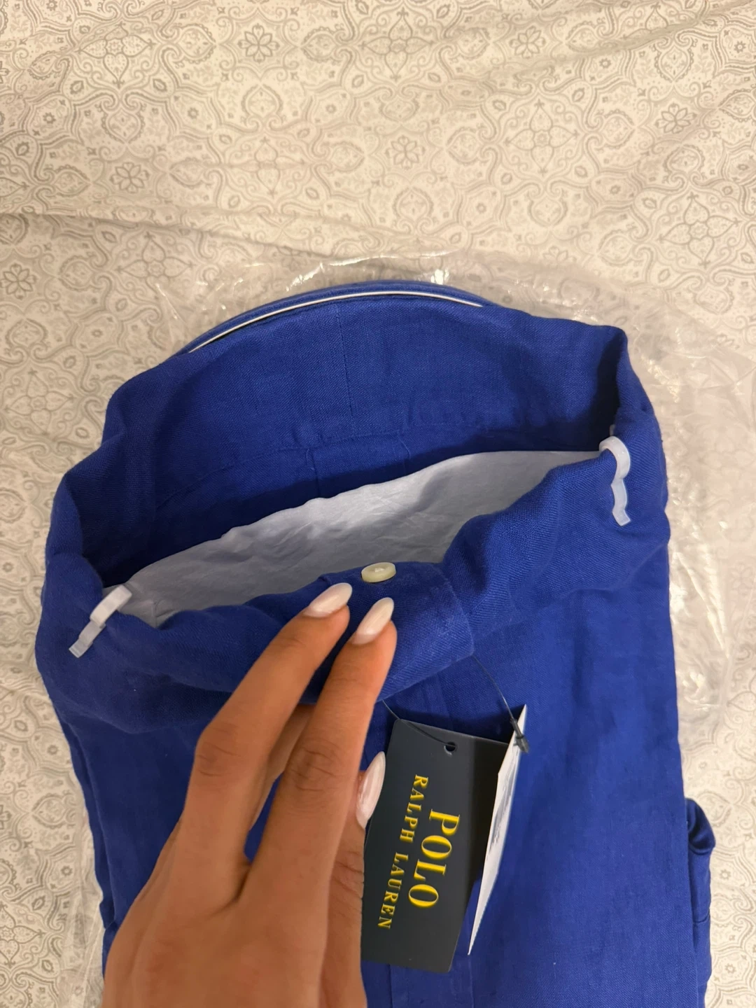 This is a Ralph Lauren Slim Fit button-down shirt. It's made of linen and comes in a royal blue colour. Size XL.