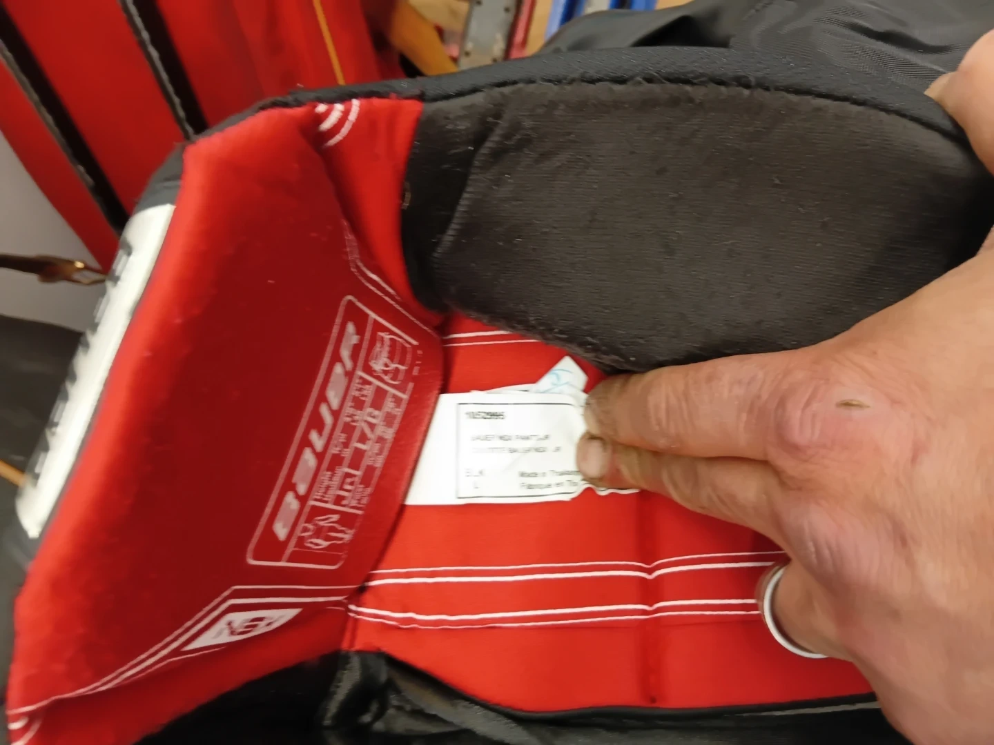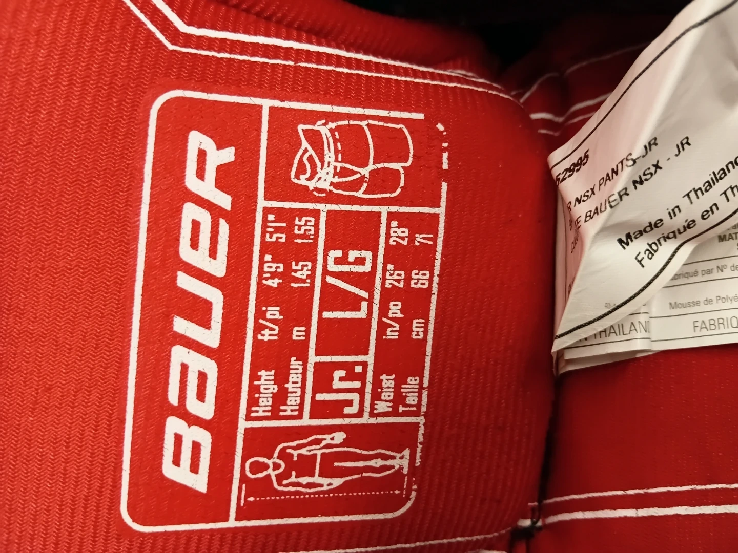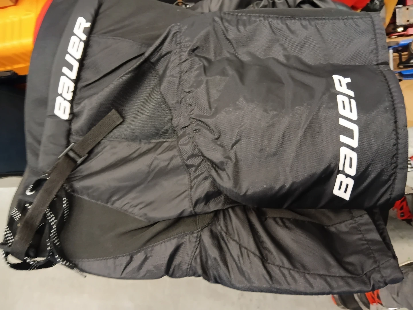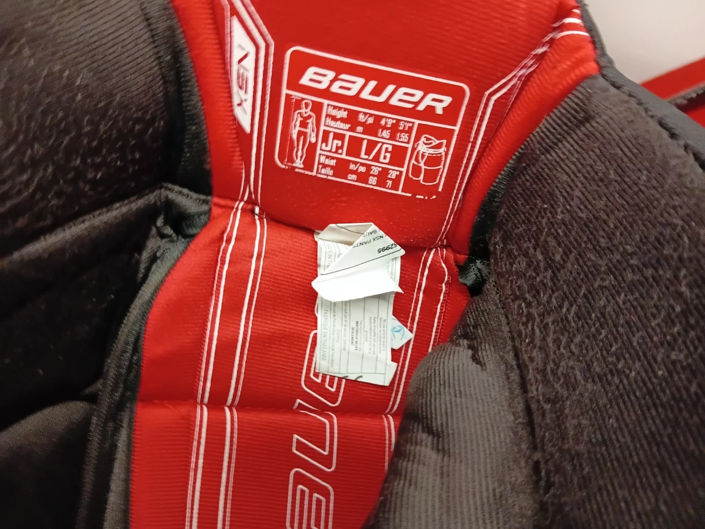 These black Bauer hockey pants are a junior large size. They feature a black exterior with red interior lining. The brand logo is prominently displayed on the legs.