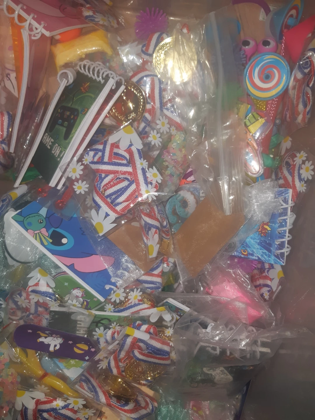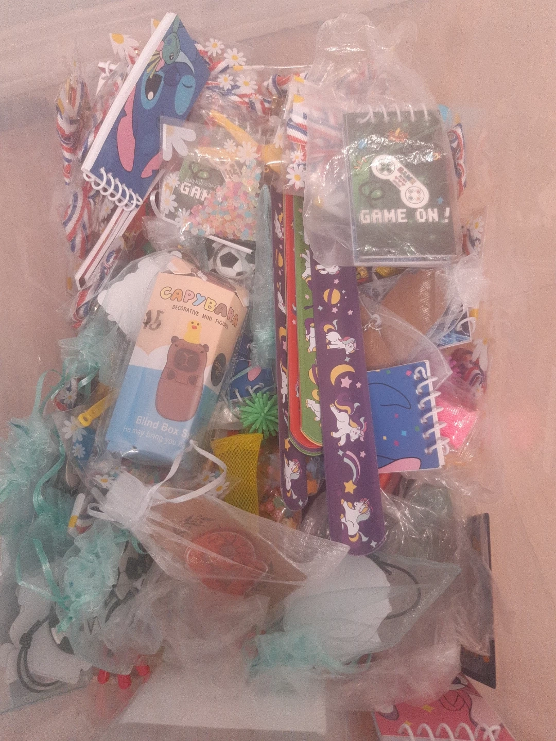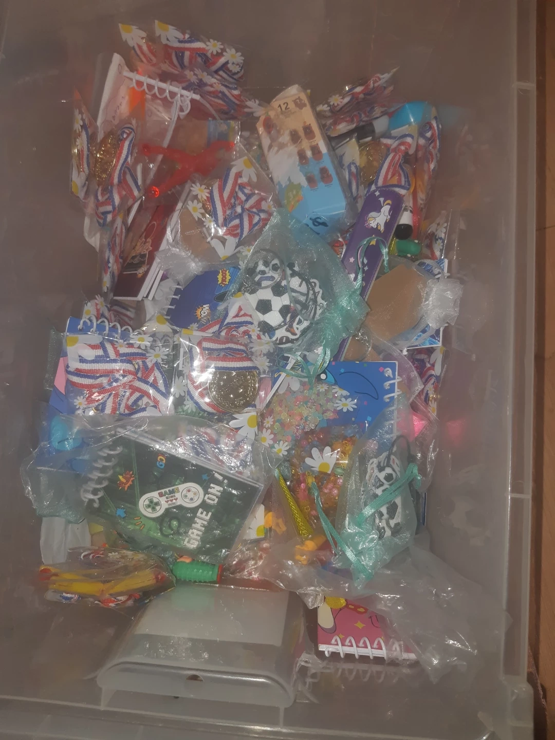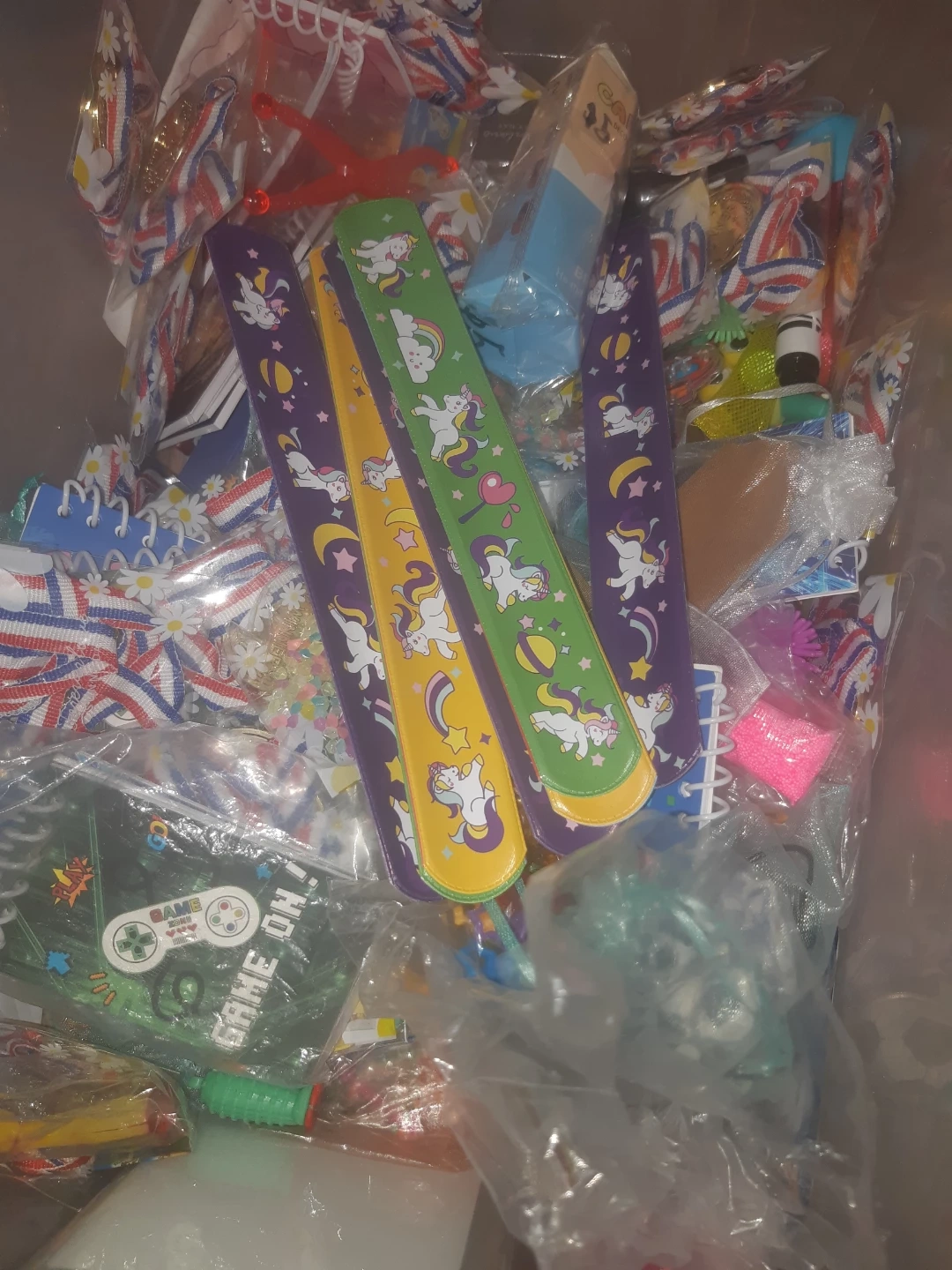 A large bin filled with various fun novelty items and party favours! Includes slap bracelets with unicorns, 'Game On!' video game themed items, medals, and small packaged toys. Great for party bags or small gifts!