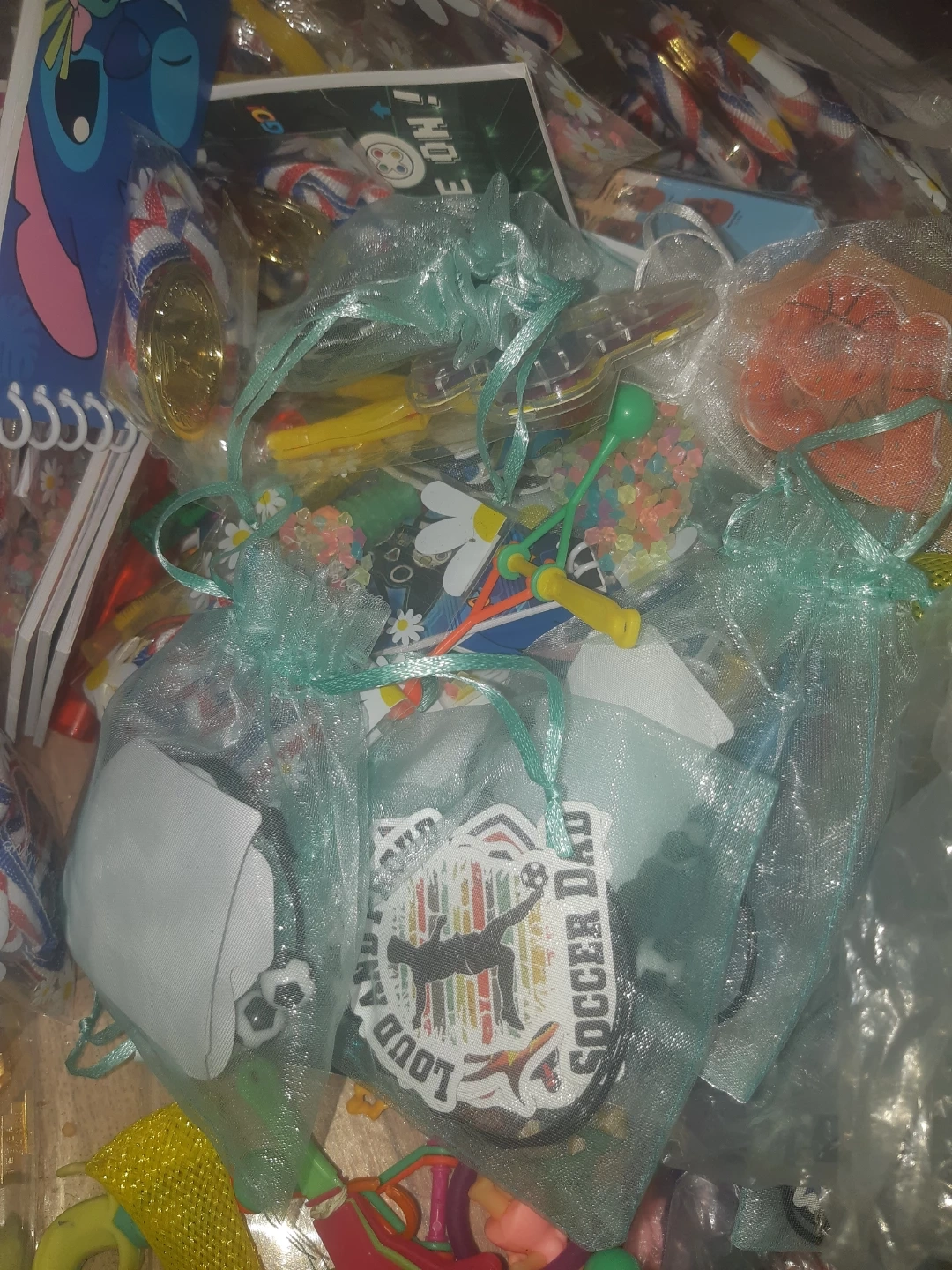A large bin filled with various fun novelty items and party favours! Includes slap bracelets with unicorns, 'Game On!' video game themed items, medals, and small packaged toys. Great for party bags or small gifts!