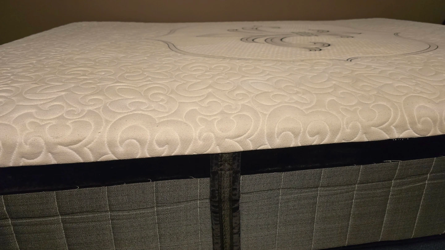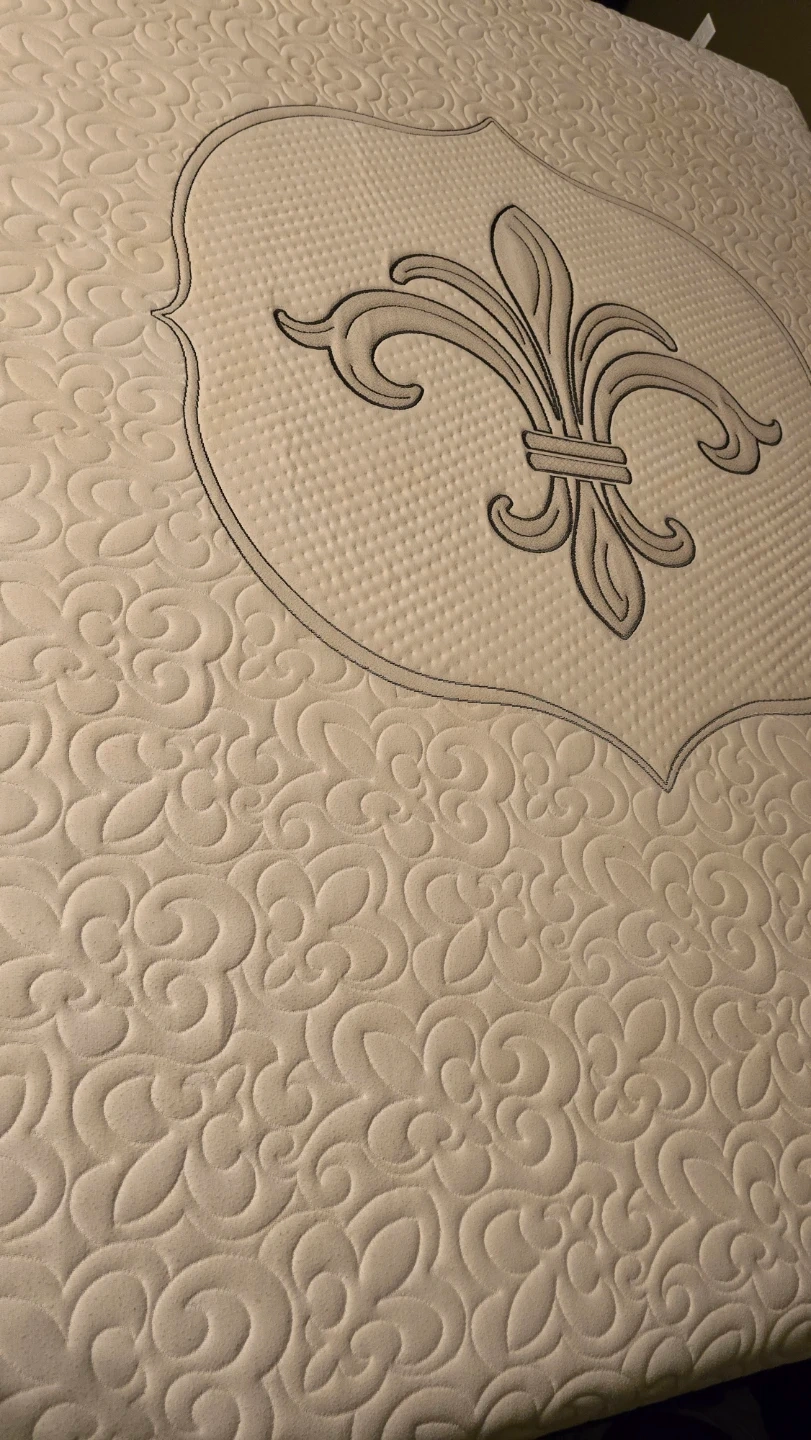 This mattress features a white quilted top with a decorative fleur-de-lis emblem. The sides are a dark grey textured fabric. It's a standard queen size mattress with a plush top. Coming from pet and smoke free home