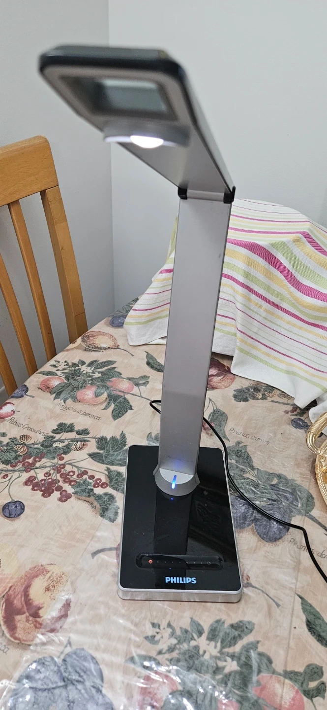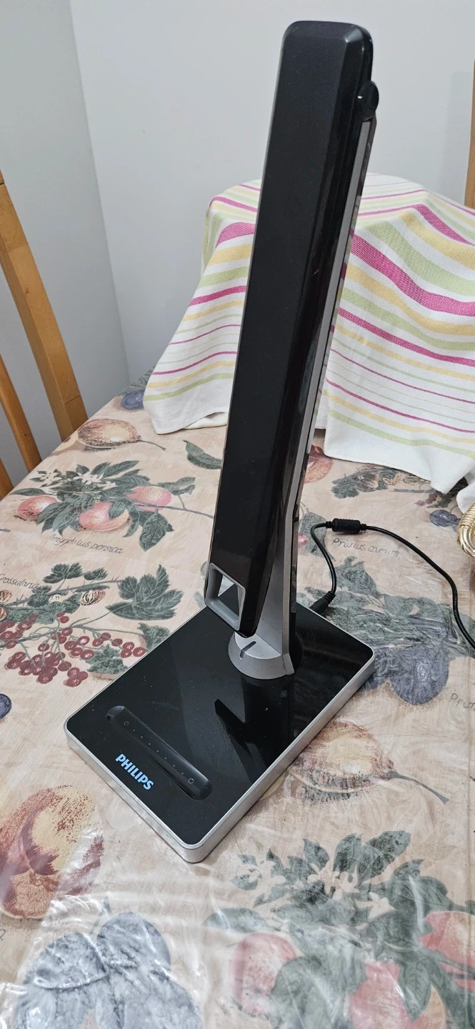 This is a Philips LED desk lamp with a sleek black and silver design. It's adjustable for your lighting needs. This lamp is great for illuminating your workspace or study area.