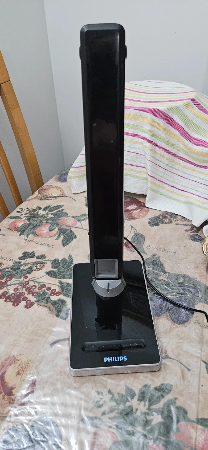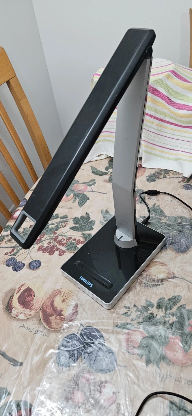 This is a Philips LED desk lamp with a sleek black and silver design. It's adjustable for your lighting needs. This lamp is great for illuminating your workspace or study area.