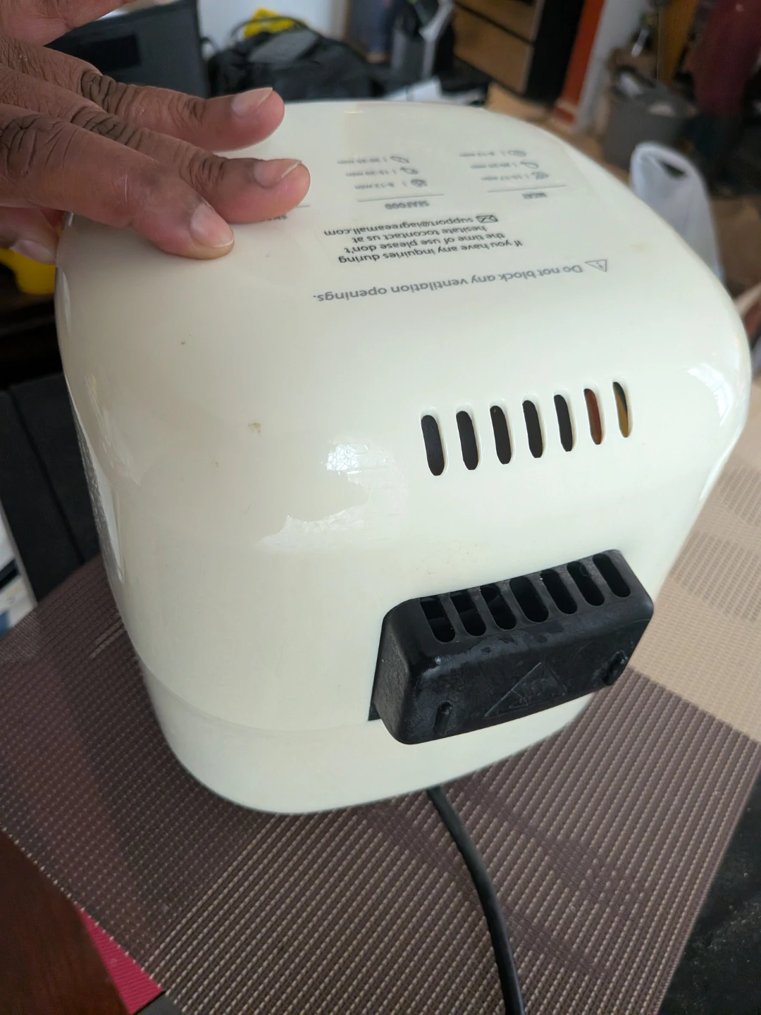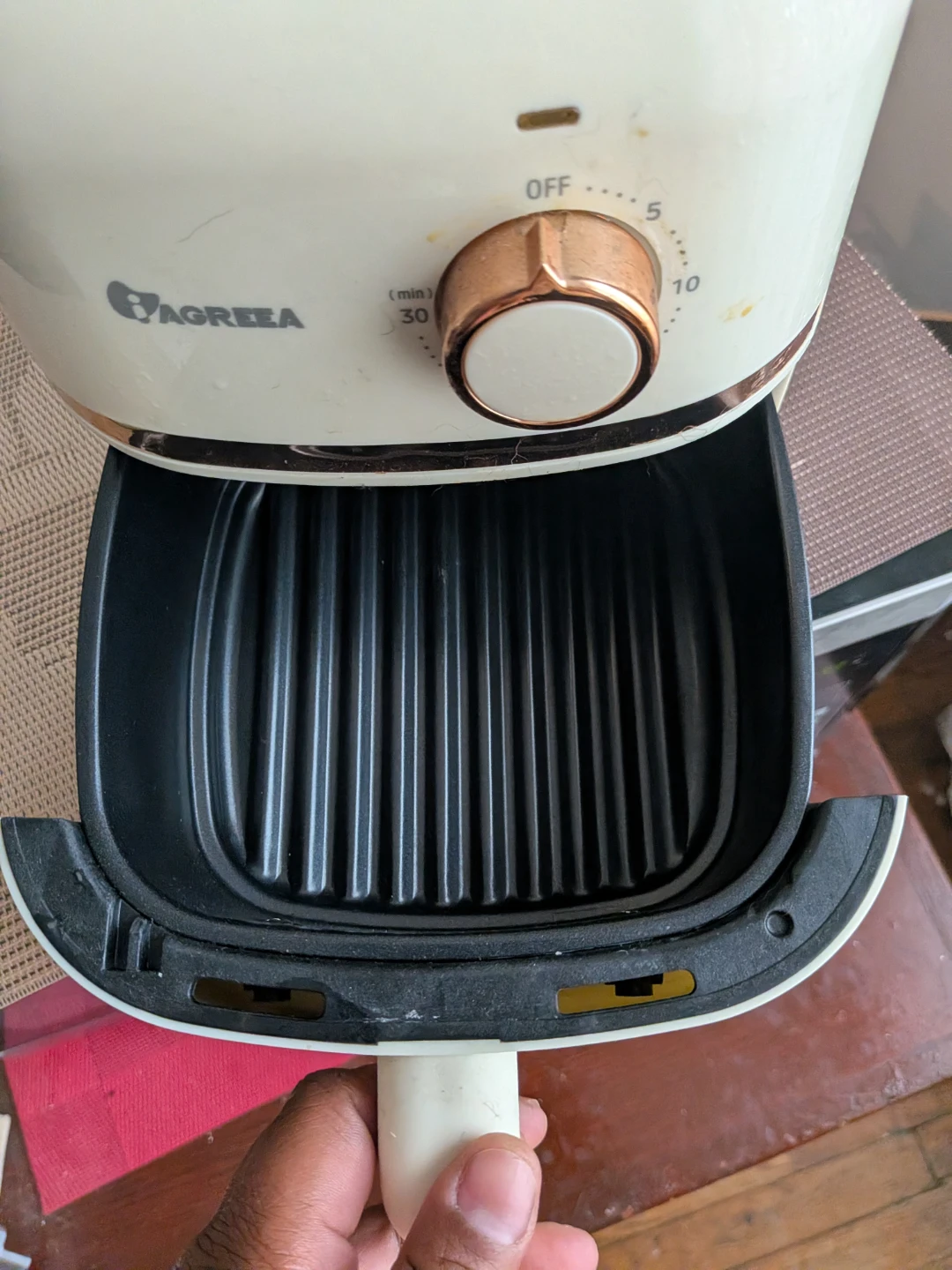This is a cream-colored Agreza air fryer. It has a timer that goes up to 30 minutes. The interior basket is removable for easy cleaning.