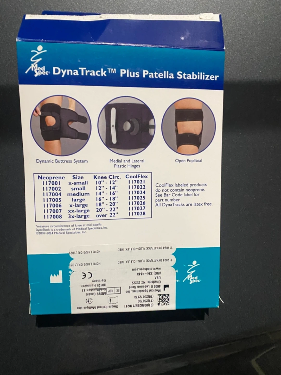New Med Spec DynaTrack Plus Patella Stabilizer. This patented design helps treat patellofemoral pain. It's made with neoprene. The size is medium and the knee circumference is 14"-16". I have two available. $100 for one or $180 for two.