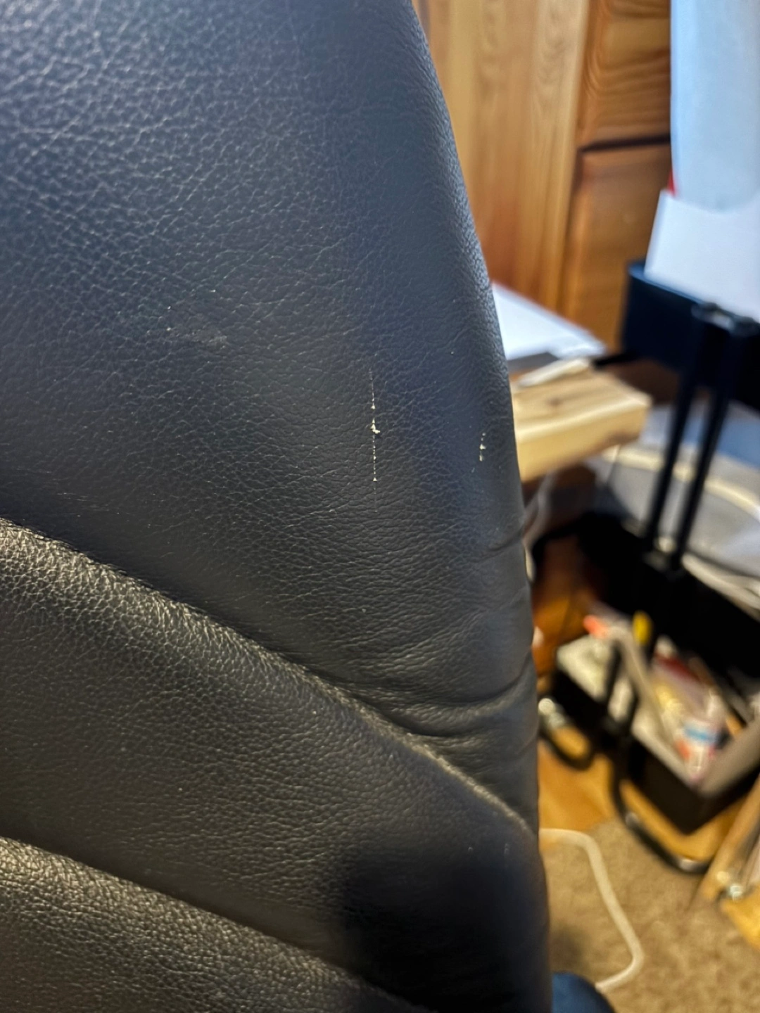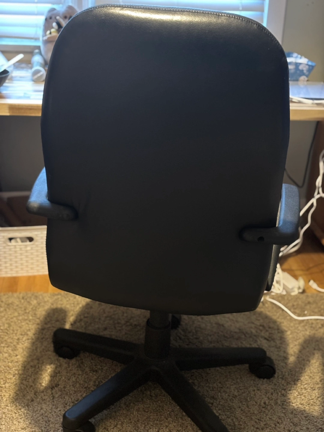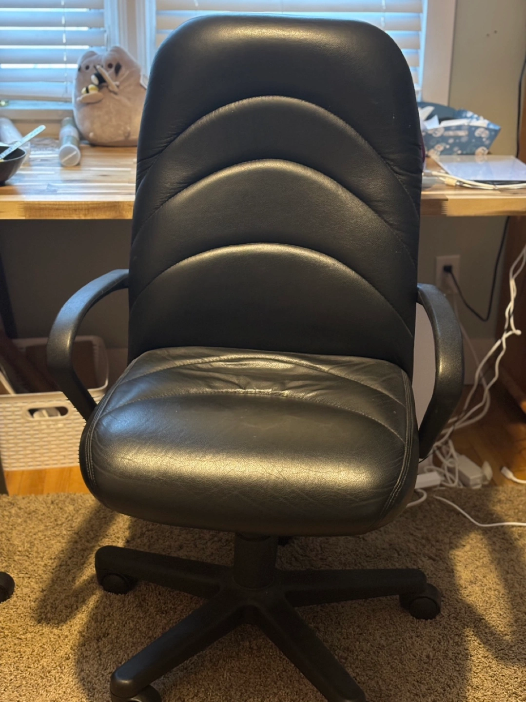 Comfortable black faux leather office chair. Features armrests and rolling casters. Minor wear visible.