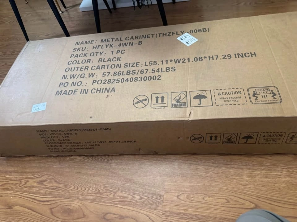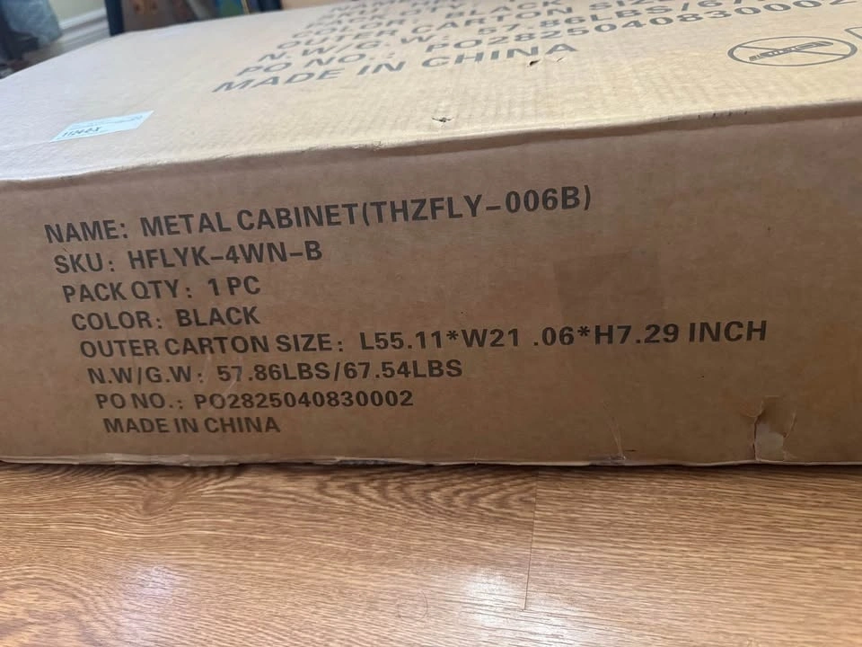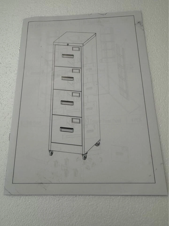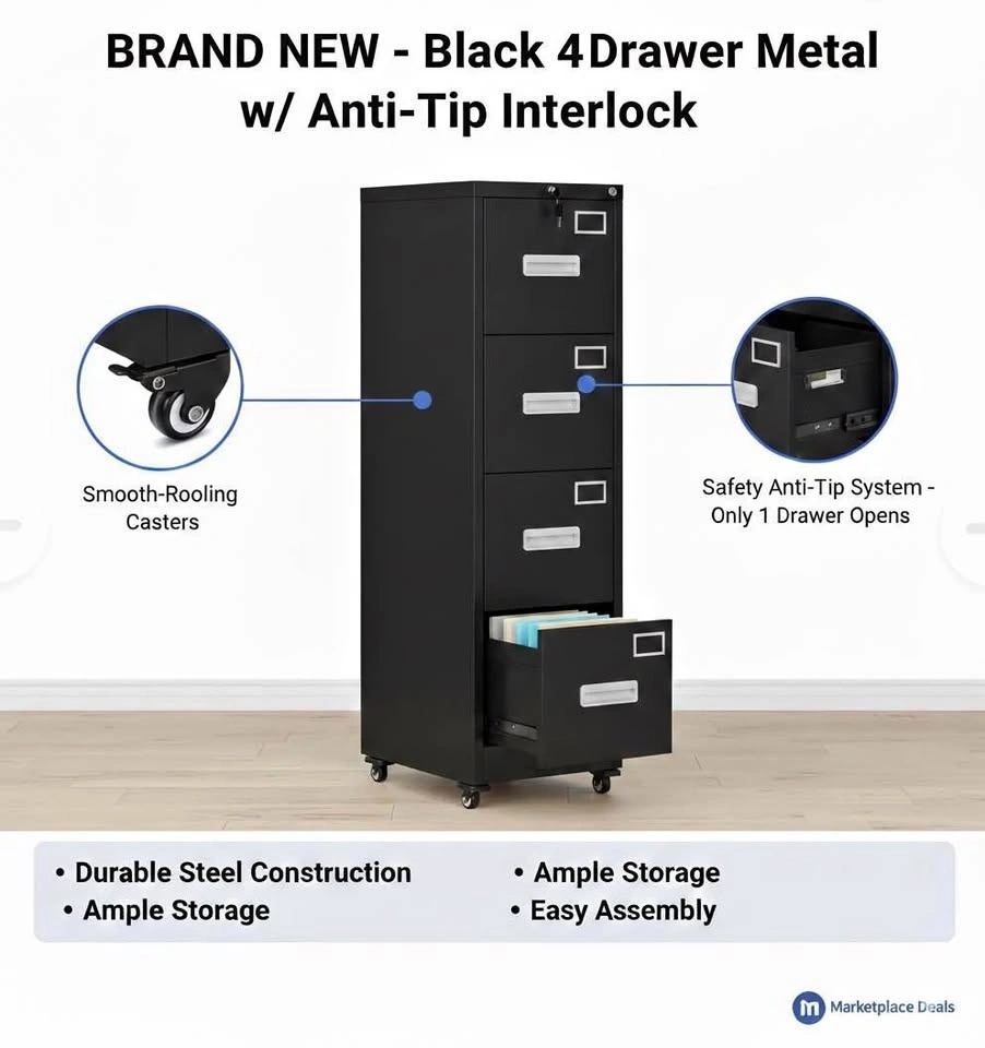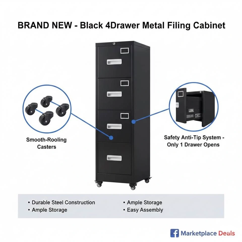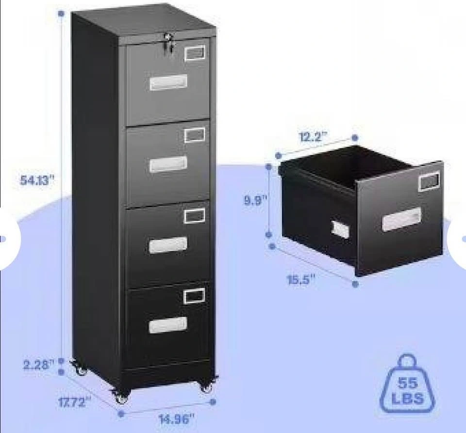 New, never used, and still packed in the box. This 4-drawer metal filing cabinet features a lock on top with two keys to secure your documents. It has an anti-tip system, an adjustable bar for letter or legal size hanging files, and a durable powder-coated finish. It also comes with 4 lockable wheels, which can be removed if you prefer a stationary cabinet. Let me know if you're interested!