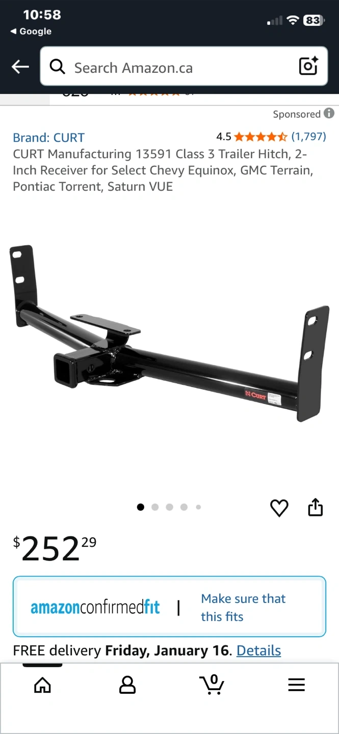 This is a CURT Class 3 trailer hitch receiver. It's a 2-inch receiver designed for select Chevy Equinox, GMC Terrain, and Saturn VUE vehicles. It has a towing capacity of 3,500 lbs and a tongue weight of 350 lbs. 6474701854