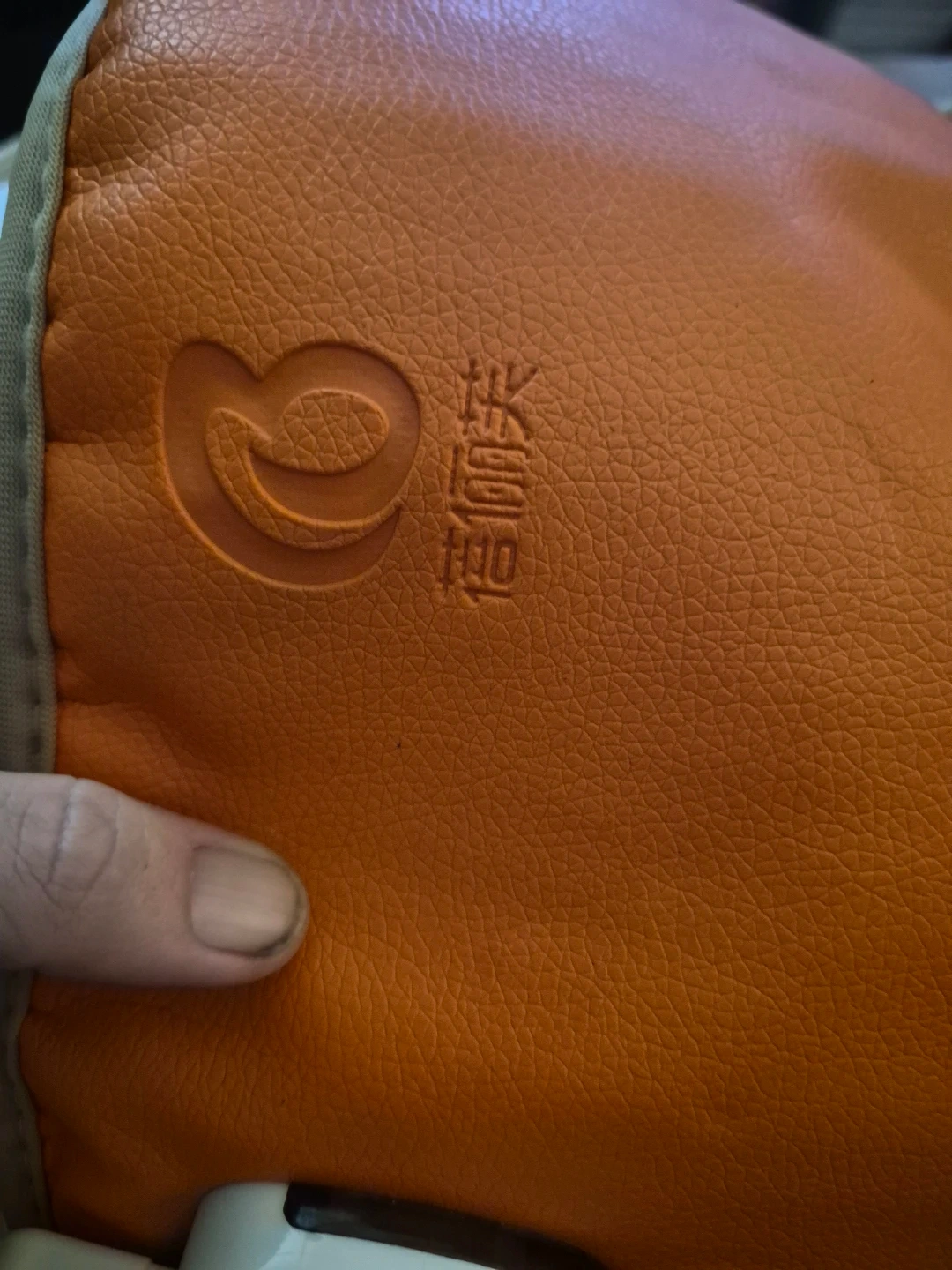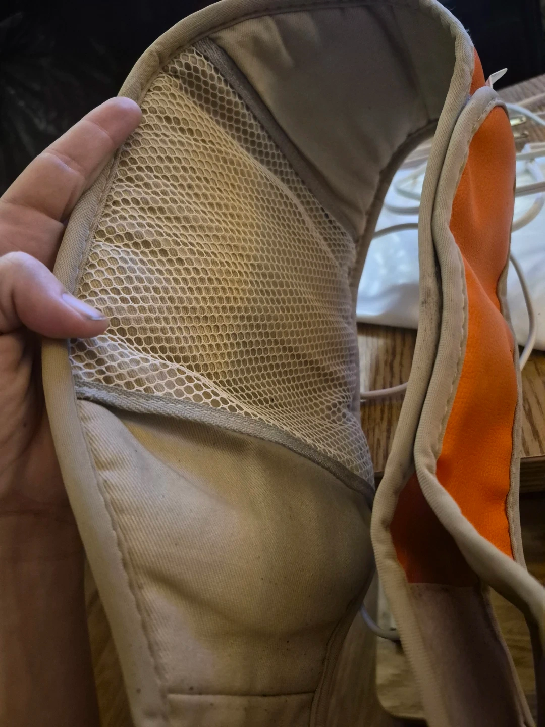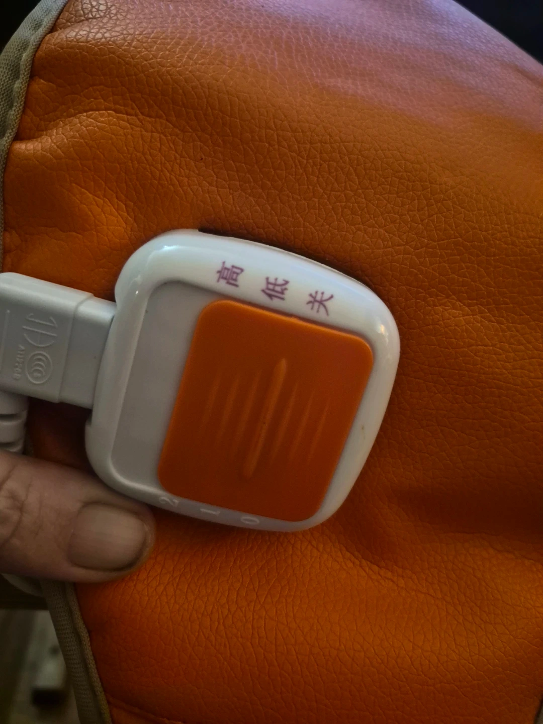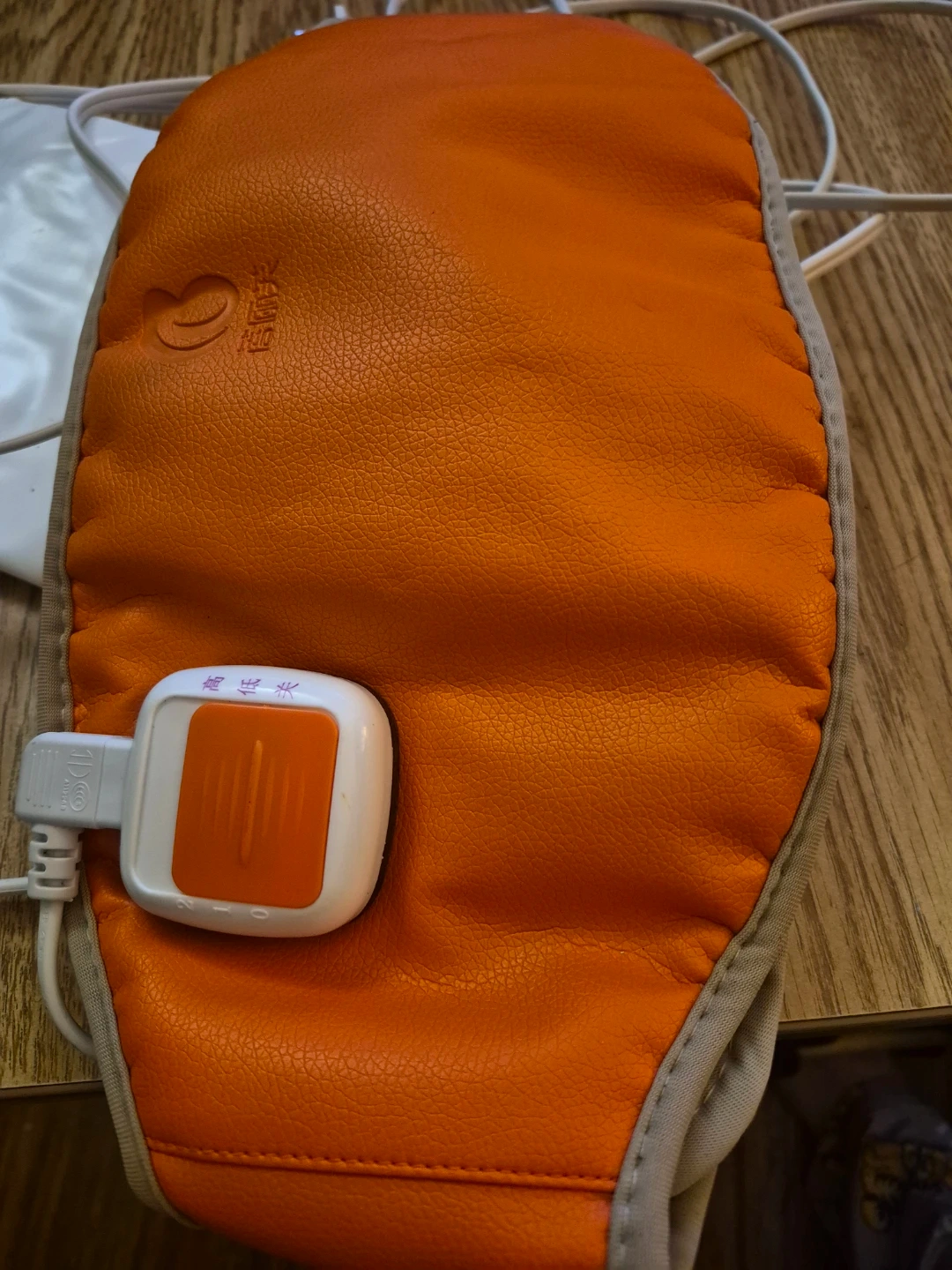 This orange heated belt offers adjustable heat settings. It's made with a faux leather exterior and a breathable mesh interior. It includes a power cord for use.