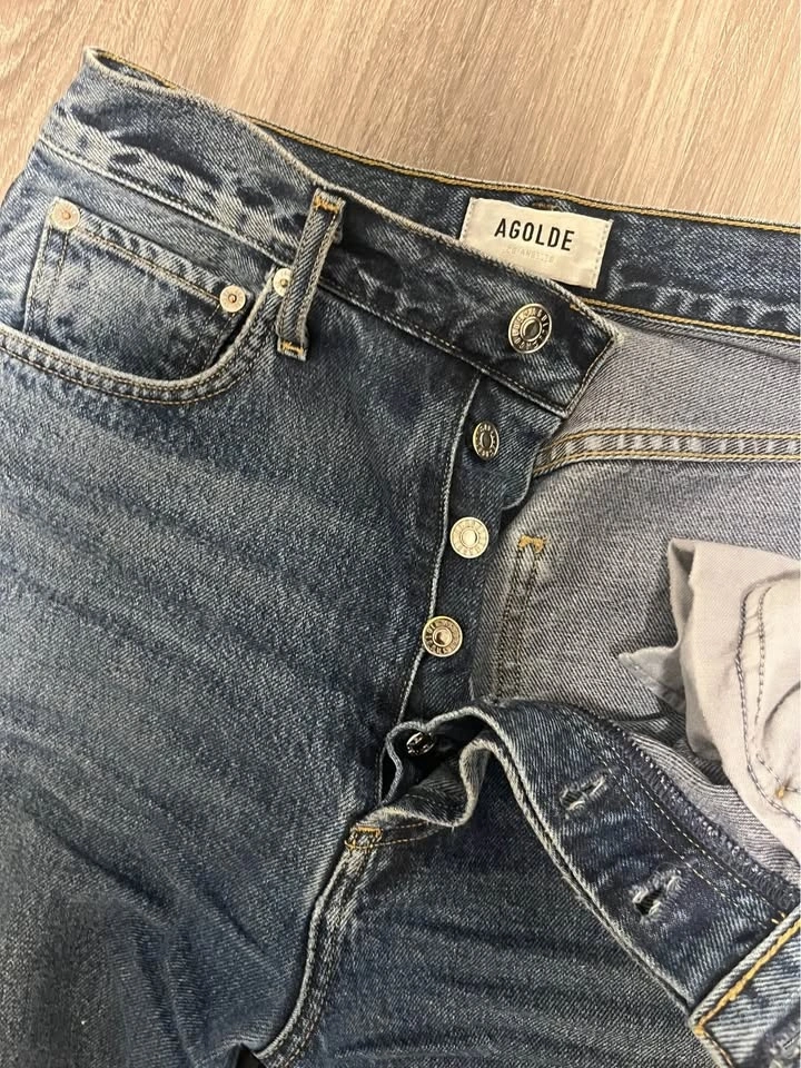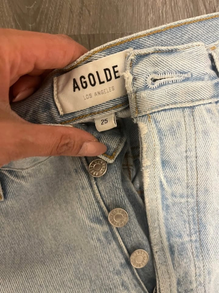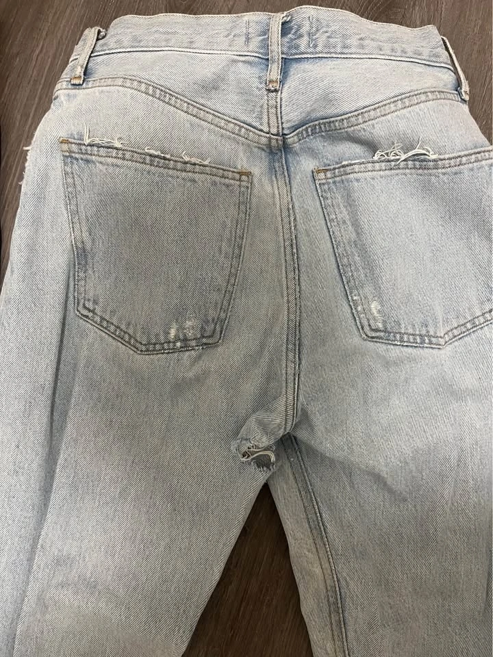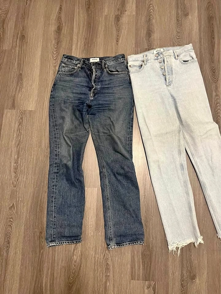 Two pairs of Agolde jeans. Dark Wash Size 23 (fits like 25) and Light Wash Size 25. Both pairs ripped in the same area. Both are a thicker style denim with no stretch. Could be up-cycled for an art project or repaired if desired. Each pair retails for +$300.