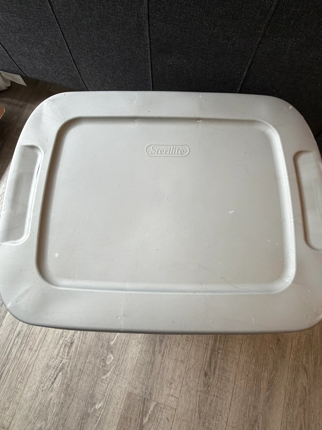Grey Sterilite storage bin with lid. Dimensions are 24" L x 18½" W x 15¾" H (61 cm x 47 cm x 40 cm). This bin is 18 Gallons or 68 Litres.